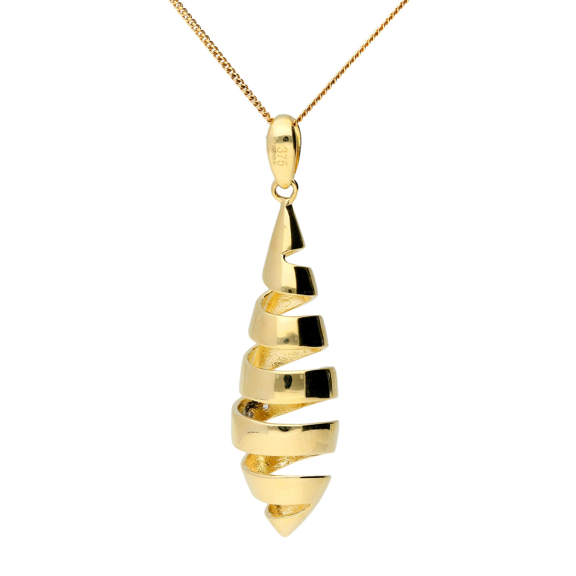 Elevate your style with our stunning 9ct yellow gold diamond pendant, a masterpiece of elegance and craftsmanship. This pendant boasts an artistic elliptical spiral of yellow gold, enhanced by a swirl of intricately set tiny diamonds that provide a subtle yet captivating sparkle. Dangling gracefully from a polished bail, this piece is accompanied by a sleek yellow gold chain, offering a seamless look that complements any outfit. Whether you're dressing for a special occasion or adding a luxurious touch to your everyday attire, this diamond pendant is the perfect choice for adding a sophisticated and timeless element to your look.