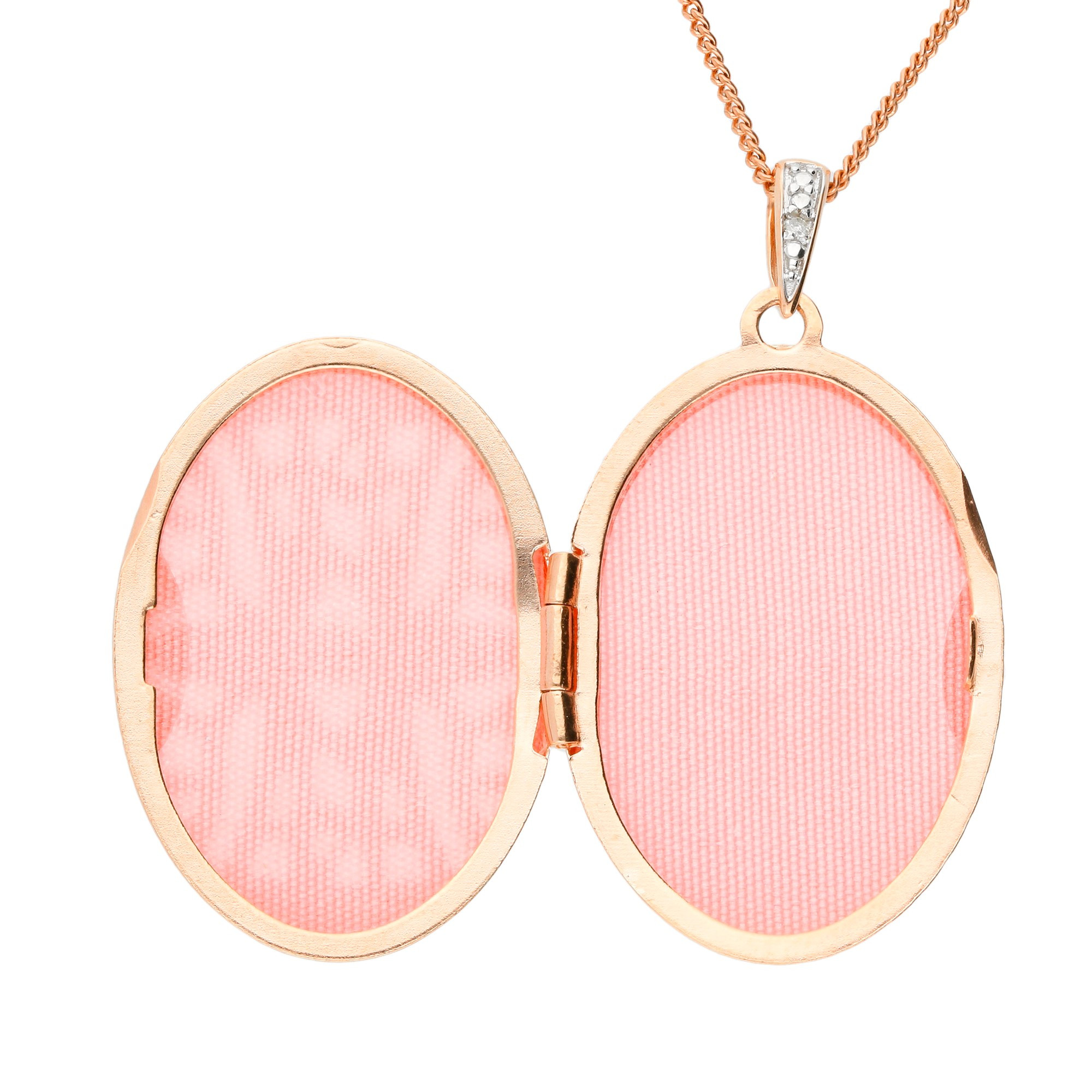 Discover the elegance of our 9ct Rose Gold Locket, a beautifully crafted piece that captures the essence of timeless style. This oval locket showcases an intricate openwork pattern on the front, designed in rose gold with a tiny central accent diamond that brings a hint of sparkle to its refined design. The reverse side is kept plain, making it perfect for custom engraving to hold a unique message or significant date close to the heart. Suspended from a diamond set surmount and paired with a matching rose gold chain, this locket is available in multiple lengths for versatile wear. Whether gifted as a symbol of love or added to your own jewellery collection, this rose gold locket offers a blend of classic elegance and personal sentiment, making it a cherished accessory for any occasion.