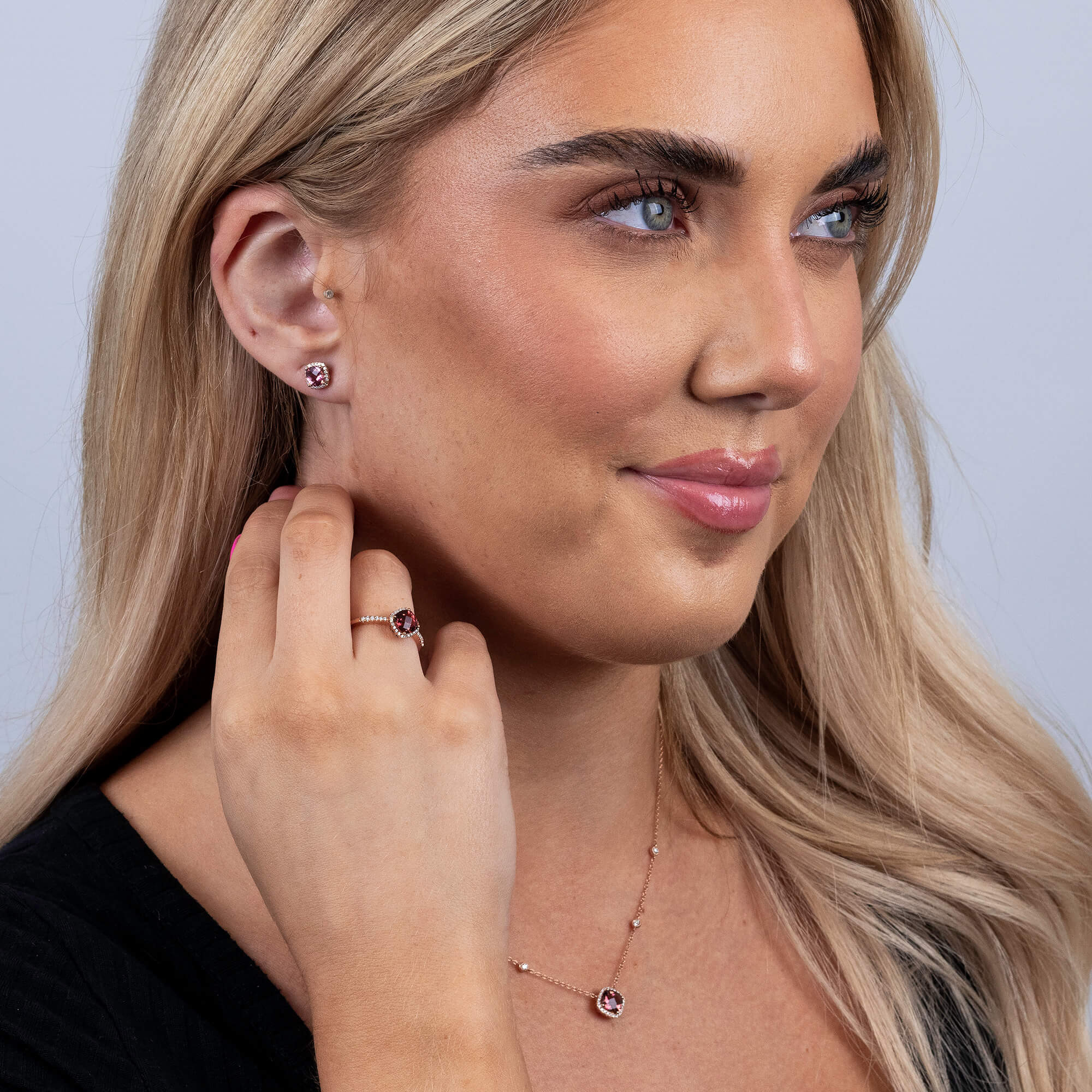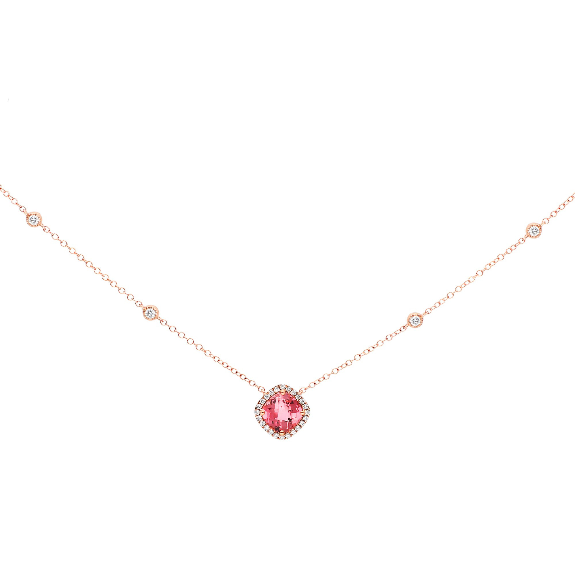 This elegant 9ct rose gold necklace showcases a radiant cushion cut pink tourmaline, framed by a halo of diamonds for added sparkle. The delicate rose gold chain is adorned with four bezel set diamond spacers, two on either side of the tourmaline, adding a touch of luxury to the design. The warm tones of the rose gold complement the rich pink of the tourmaline, making this necklace a versatile accessory for any occasion. Whether worn alone or layered with other pieces, this tourmaline and diamond necklace is a beautiful expression of refined style and timeless elegance.