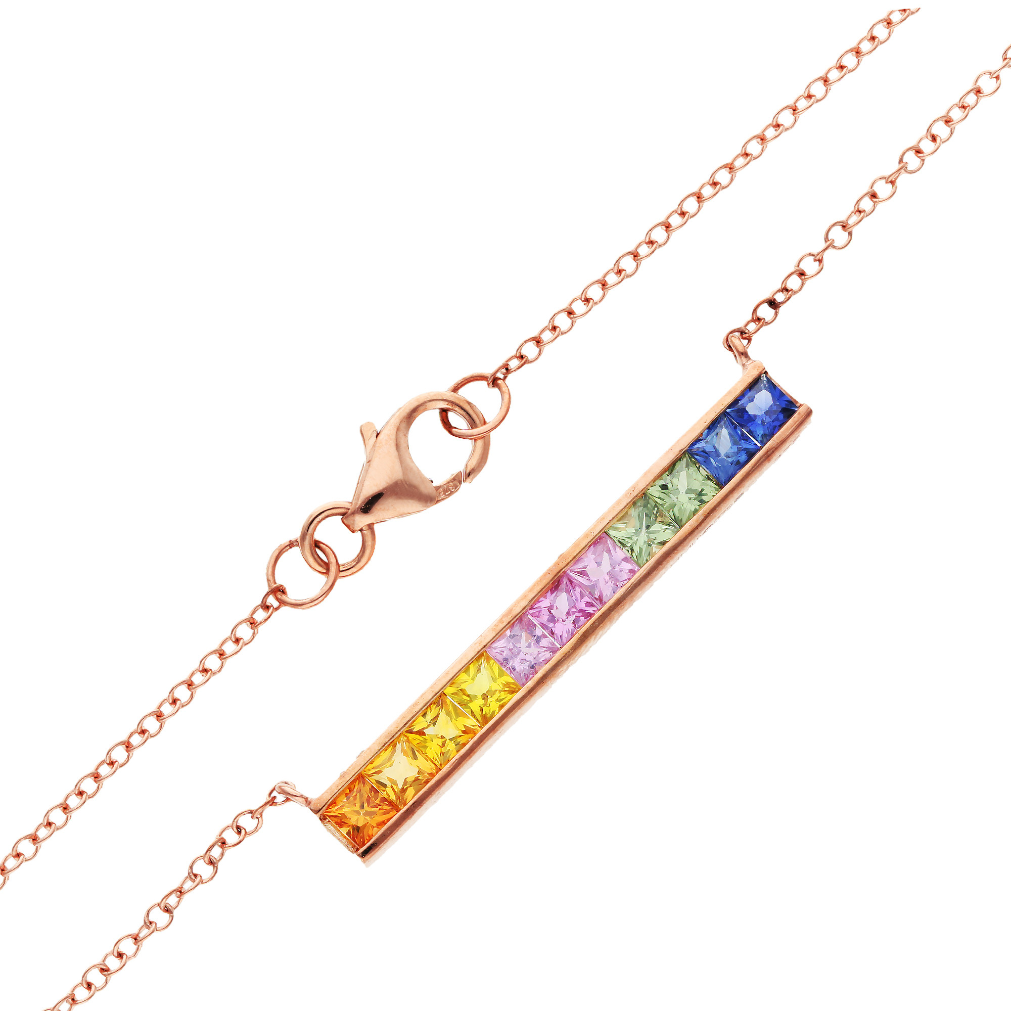 This elegant 9ct rose gold necklace showcases a bar design, channel set with square cut sapphires in a beautiful array of colours. The rainbow sapphire arrangement, totalling 1.25ct, creates a captivating contrast against the soft warmth of the rose gold. The bar is attached to an integral rose gold chain, offering a seamless and refined look. Perfect for adding a touch of colour to any outfit, this necklace is both versatile and timeless. Whether worn alone or layered with other pieces, this rainbow sapphire necklace is a stylish and modern choice for those who love distinctive, colourful jewellery.