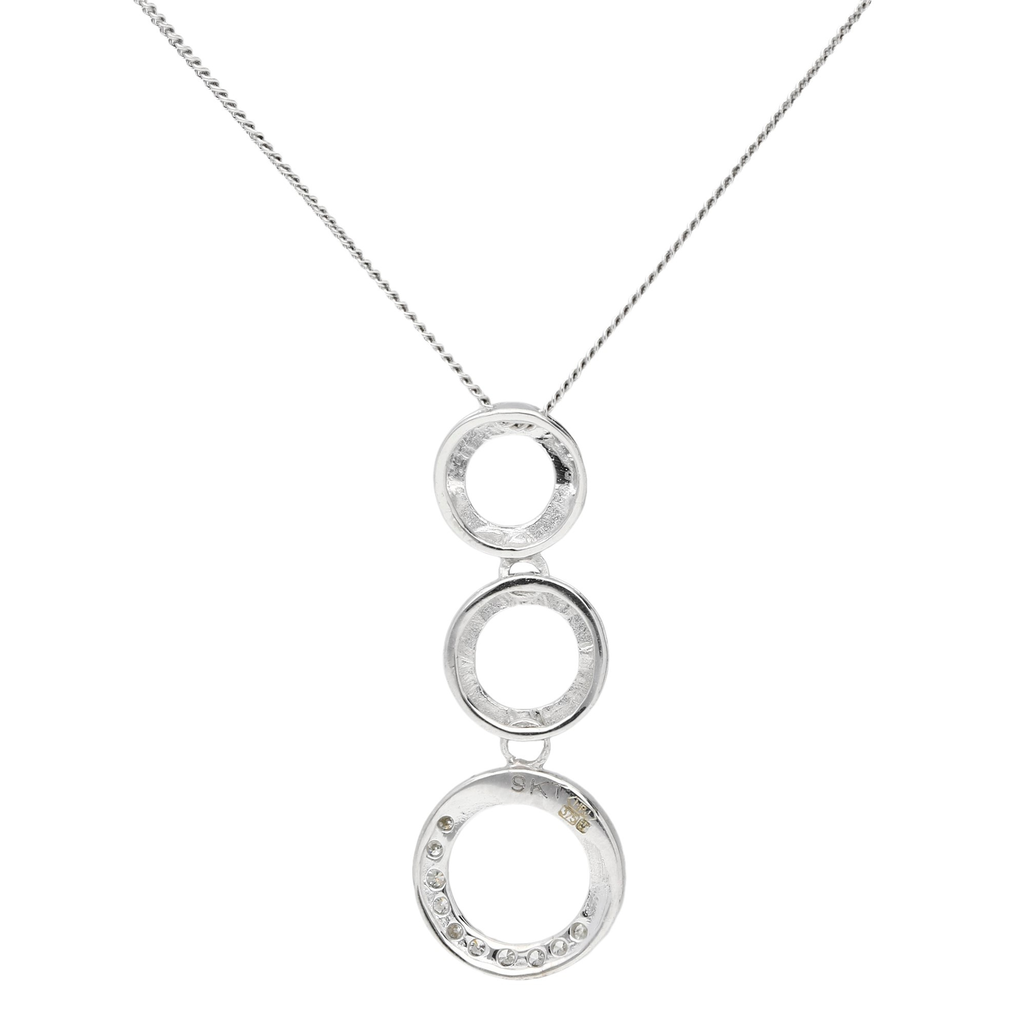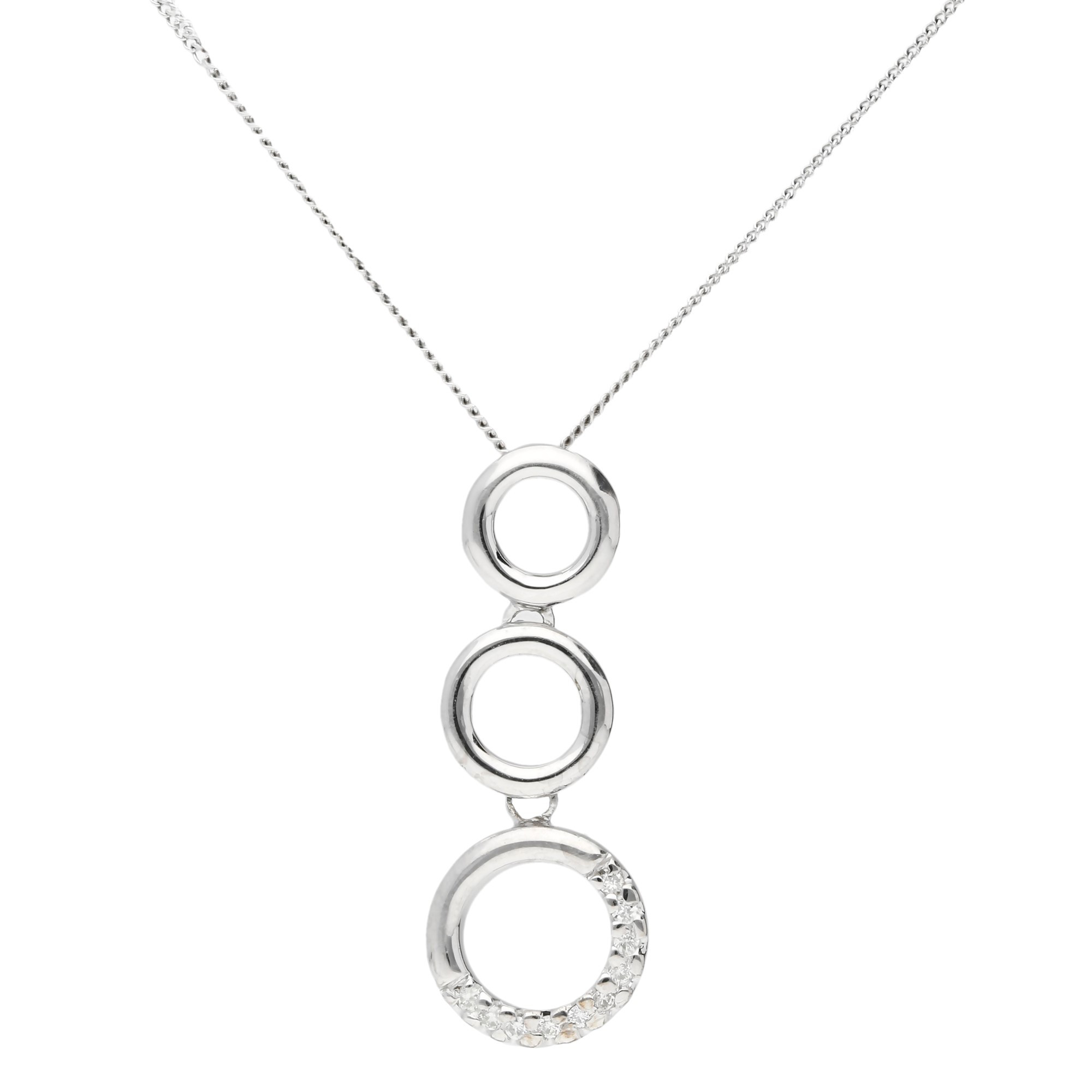Add a touch of contemporary elegance to your style with this stunning 9ct White Gold Pendant, thoughtfully designed with three graduated circles. Starting from a dainty top circle, each ring increases in size, creating a captivating layered look. The largest circle at the base is partially adorned with a line of tiny accent diamonds, bringing an extra shimmer that catches the eye. Crafted in polished white gold, this pendant is accompanied by a white gold chain, with the option to select a length that suits you best from the drop down menu. Perfect for any occasion, this necklace offers a chic blend of simplicity and sparkle, making it an ideal gift or a sophisticated addition to your own jewellery collection.