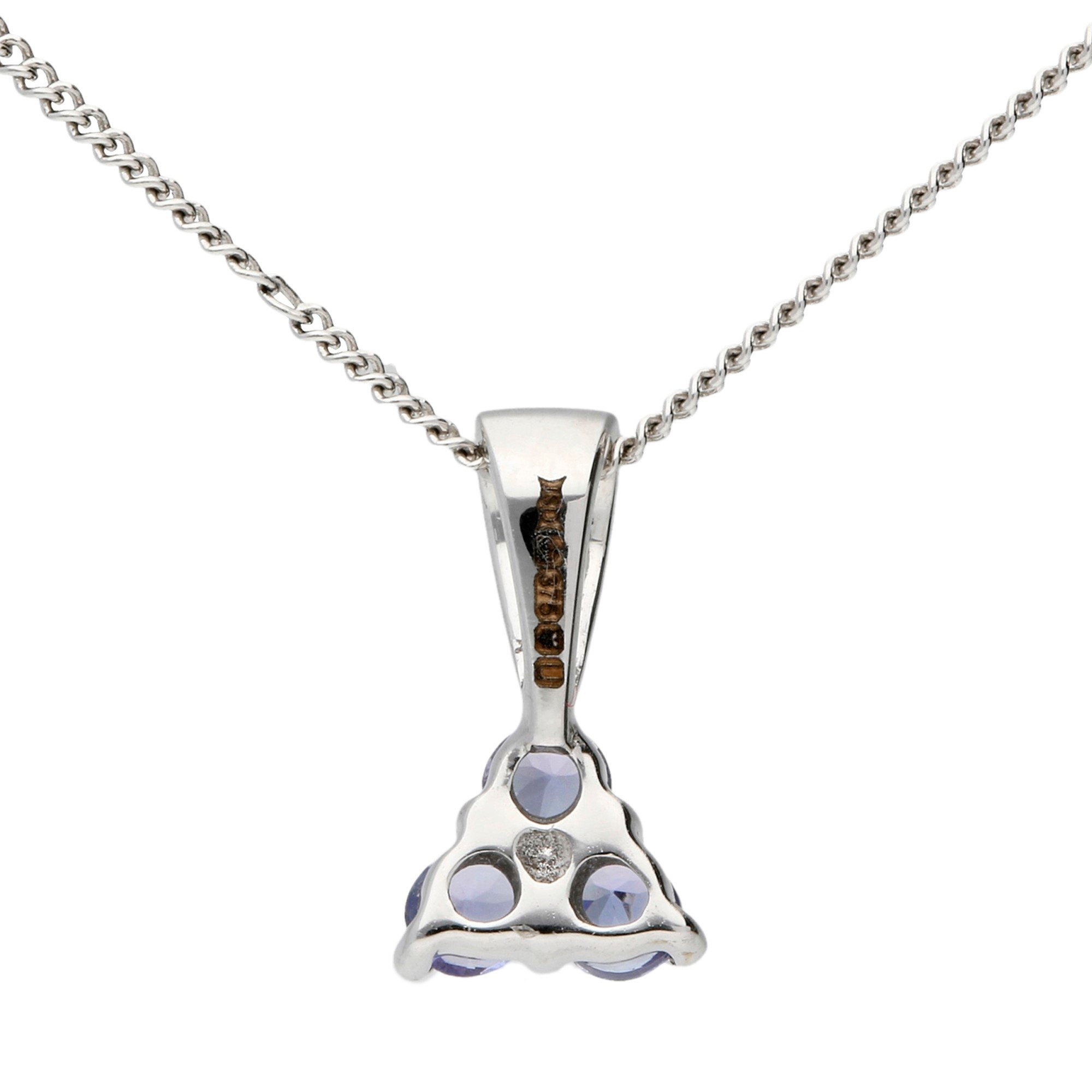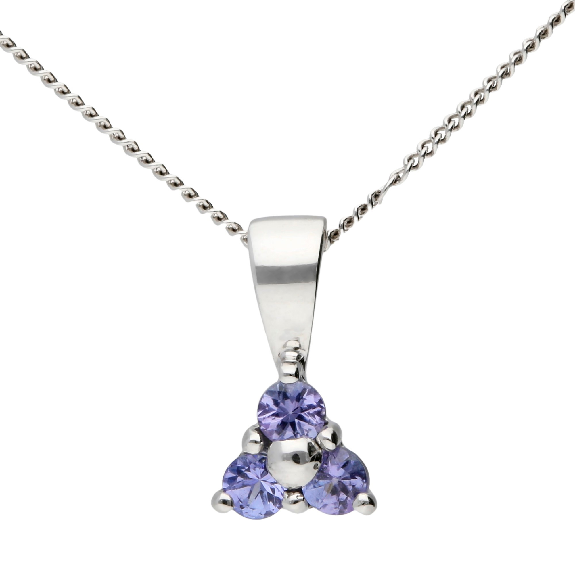 This beautiful sterling silver pendant is a graceful expression of colour and style. It features a trio of round tanzanite gemstones, carefully claw set in a neat triangular design. The arrangement is subtle yet eye catching, highlighting the unique blue violet hue of tanzanite that shimmers in the light with every movement.