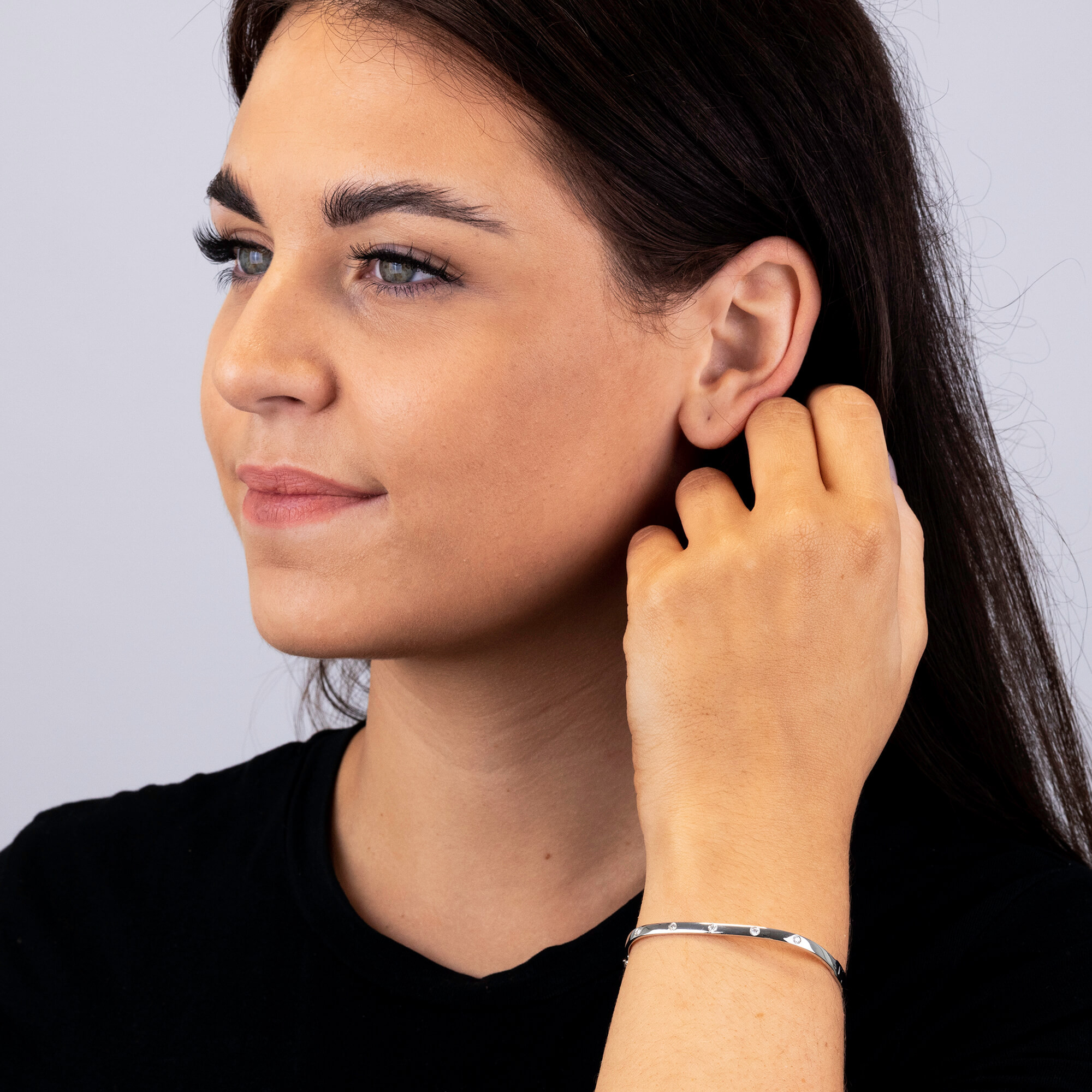 Discover the allure of our 9ct White Gold 0.20ct Diamond Bangle, an exquisite piece that combines modern chic with timeless glamour. This chunky bangle is adorned with five round brilliant cut diamonds, summing up to 0.20ct, each expertly set to showcase their dazzling brilliance. The bangle's design is enhanced with a discreet hinge and an easy to use push in clasp, offering both security and style. Whether you're looking for a special Christmas gift or an anniversary treat, this diamond bangle makes a luxurious statement that is sure to impress and delight any recipient.