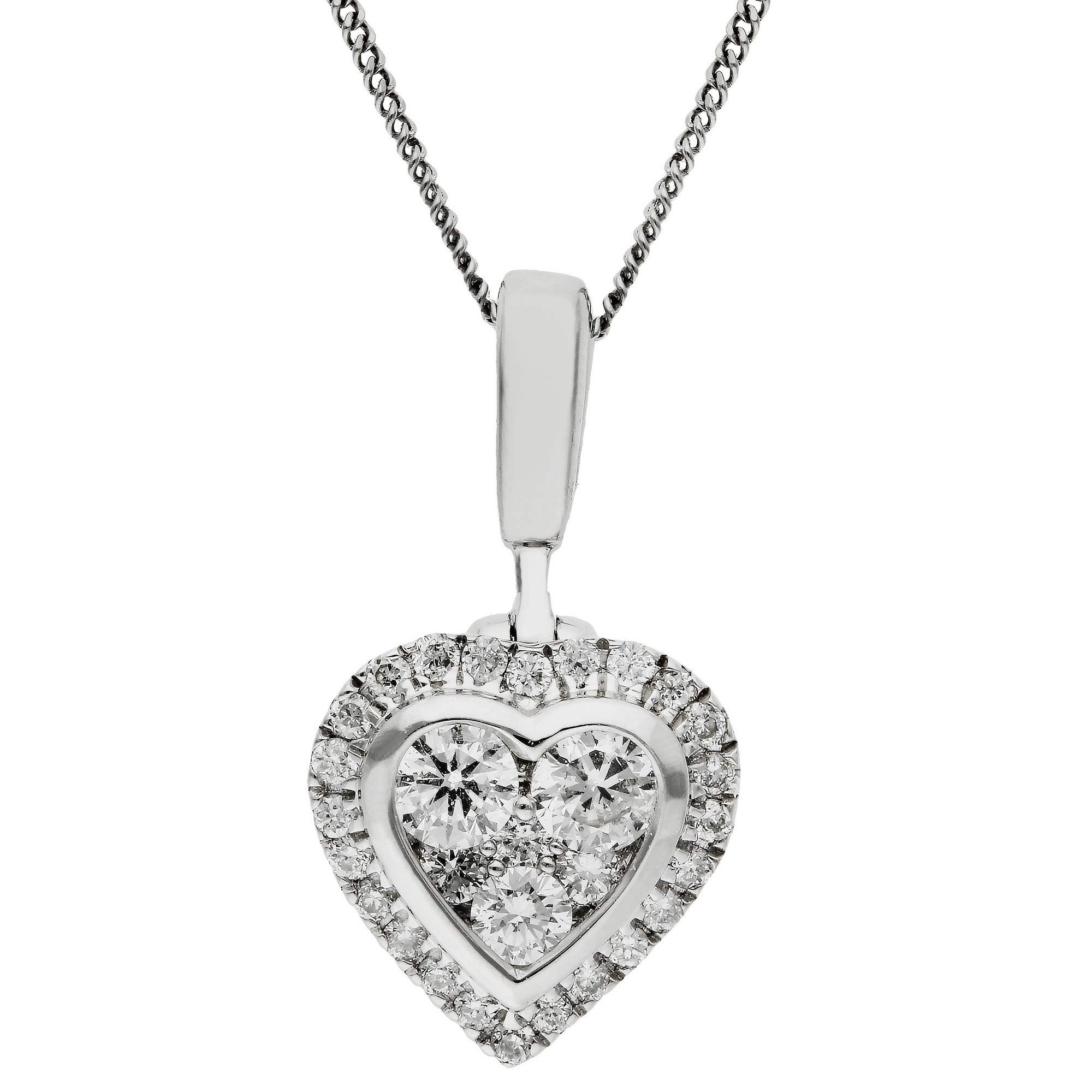 Elevate your jewellery wardrobe with our stunning 9ct White Gold Diamond Heart Pendant, a piece that combines timeless charm with contemporary flair. At the heart of this pendant is a delicately arranged cluster of diamonds, varying in size to catch the light from every angle. This cluster is encased in a double heart design, a sleek white gold heart and a surrounding diamond halo that enhances the pendant's radiant glow. Dangling gracefully from a polished white gold bail, this heart pendant is paired with a matching chain, offering an elegant and sophisticated look perfect for daily wear or special events. Whether you're looking to express your love or simply add a sparkling statement piece to your outfit, this diamond heart pendant is sure to impress.
