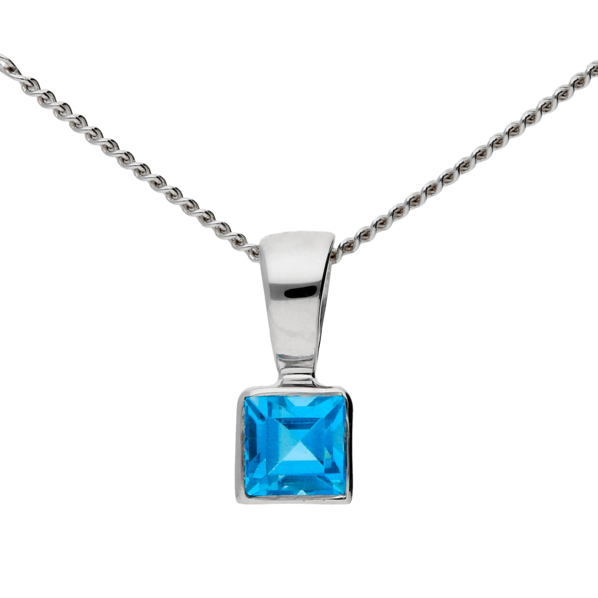 Elevate your style with this stunning 9ct white gold blue topaz pendant. Featuring a 0.10ct square cut blue topaz, the gemstone’s vivid colour and sparkling facets are beautifully highlighted by its sleek bezel setting in polished white gold. The fixed bail adds a seamless and elegant finish, making this pendant a standout piece.