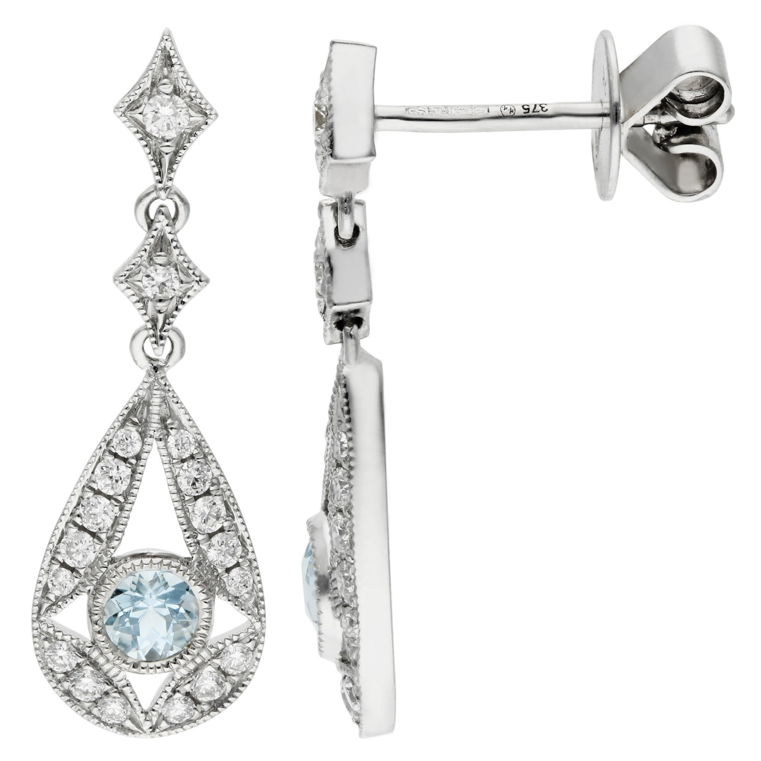 Enhance your elegance with our 9ct White Gold Diamond and 0.30ct Aquamarine Drop Earrings. These stunning women's earrings feature an ornate tear drop design, showcasing a central round cut aquamarine surrounded by dazzling diamonds. The earrings are crafted in three intricate parts: a two part diamond surmount and a tear drop bottom, all adorned with delicate beaded edging. Perfect for adding a touch of sophistication to any outfit, these drop earrings are ideal for special occasions or everyday luxury. The 9ct white gold setting enhances the brilliance of the gemstones, making these earrings a timeless addition to your jewellery collection. Treat yourself or a loved one to the refined beauty of these exquisite diamond and aquamarine drop earrings.
