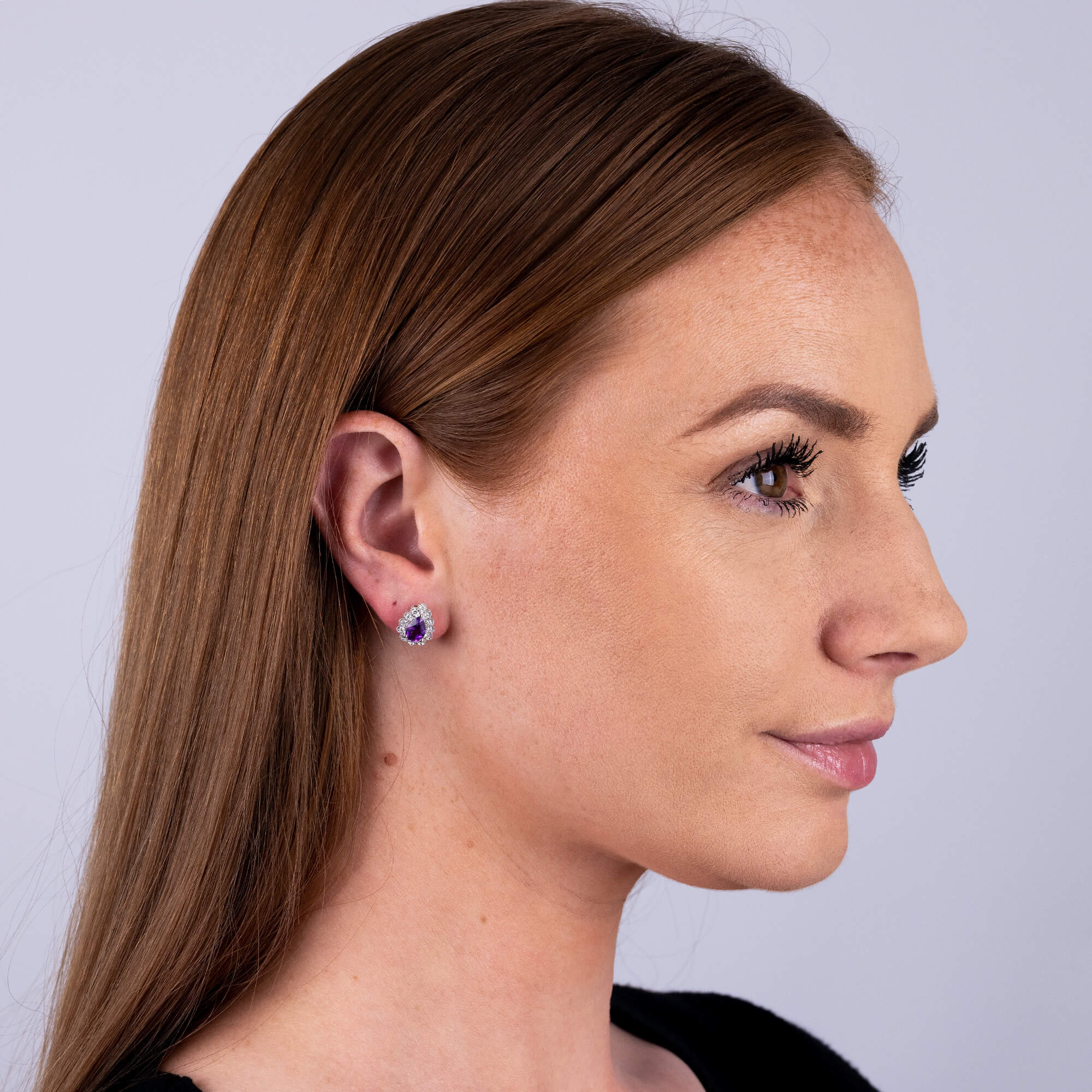 Discover the allure of our 9ct White Gold Diamond and 1.40ct Amethyst Stud Earrings. These stunning women's earrings feature pear shaped amethysts, elegantly framed by sparkling diamonds and delicate milgrain edging. The deep purple of the amethysts contrasts beautifully with the bright diamonds, creating a captivating and sophisticated look. Crafted with secure posts and butterfly backs, these stud earrings ensure comfort and ease of wear. Perfect for adding a touch of luxury to everyday attire or complementing an elegant evening look, these earrings are a timeless addition to any jewellery collection. Elevate your style with the exquisite charm of these 9ct white gold diamond and amethyst stud earrings.