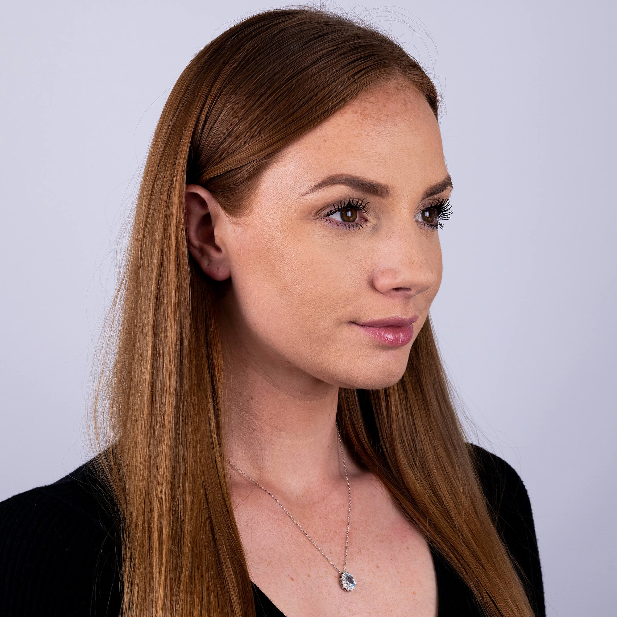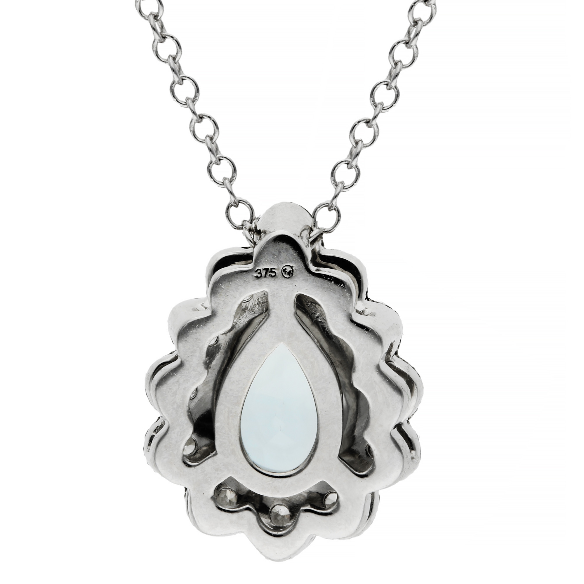 Presenting our stunning 9ct White Gold Diamond & Aquamarine Necklace, a piece that perfectly blends timeless sophistication with the tranquil beauty of the sea. At the centre is a pear cut aquamarine, its soft blue tone evoking the serenity of calm waters, elegantly framed by a halo of sparkling diamonds. Each diamond is carefully set in a milgrain design, offering a vintage inspired touch and enhancing the pendant's radiant sparkle. Suspended from a delicate white gold chain, this necklace is ideal for both daily wear and special occasions. It not only exudes elegance but also captures the calming essence of the aquamarine gemstone. Whether given as a thoughtful gift or as a special addition to your own collection, this Diamond & Aquamarine Necklace is a captivating piece that will be treasured for years to come.