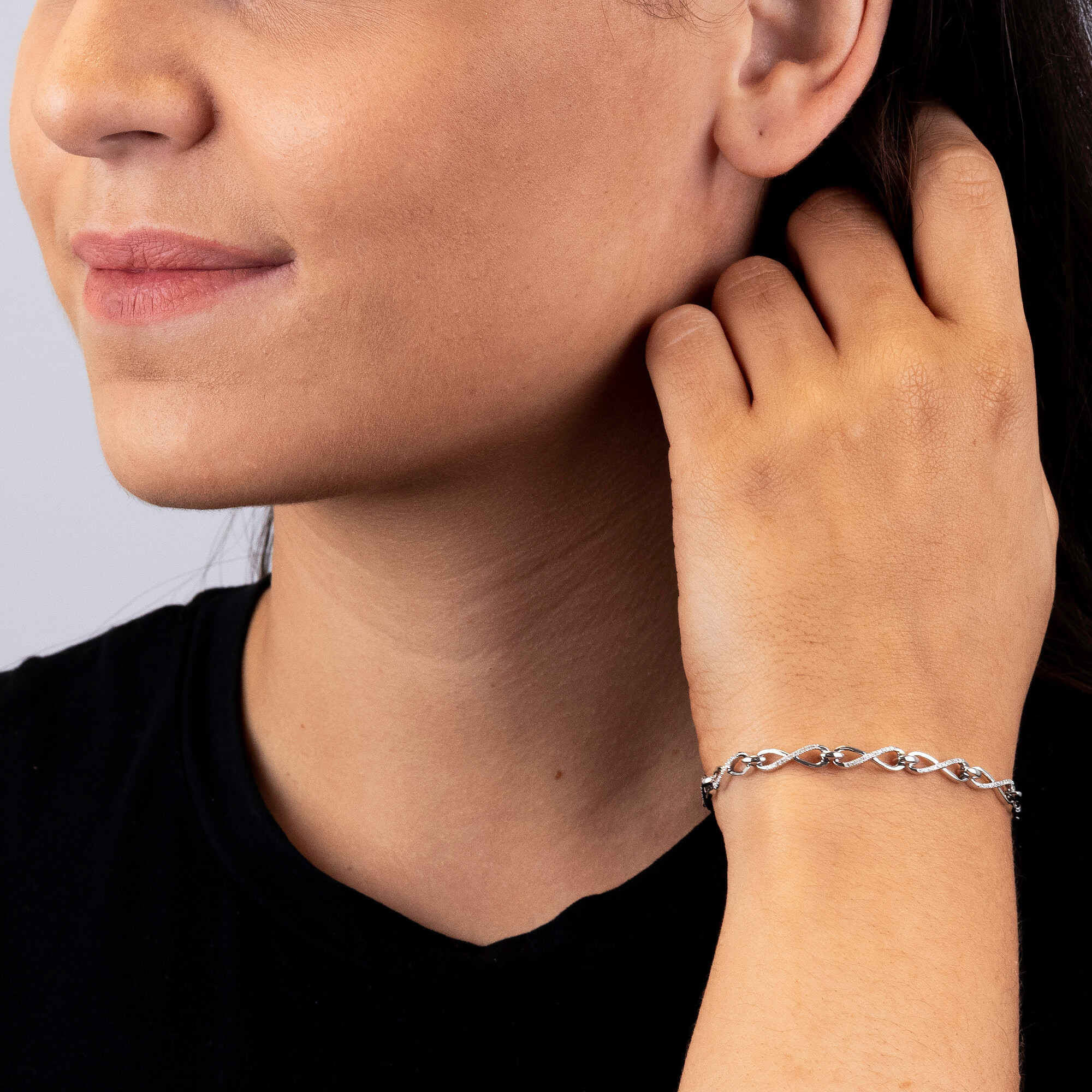 Indulge in the sophistication of our 9ct White Gold Diamond Bracelet, a perfect blend of classic design and modern allure. Each link of this elegant bracelet is crafted in the finest white gold, featuring infinity openwork patterns that are delicately adorned with glittering diamonds. This piece is designed to dazzle at any evening event, enhancing your outfit with its luxurious finish. Ideal for gifting on Valentine's Day, an anniversary, or to celebrate an April birthday, this bracelet is a thoughtful and luxurious choice that will be treasured for years to come. Add this stunning piece to your collection to elevate your jewellery game.