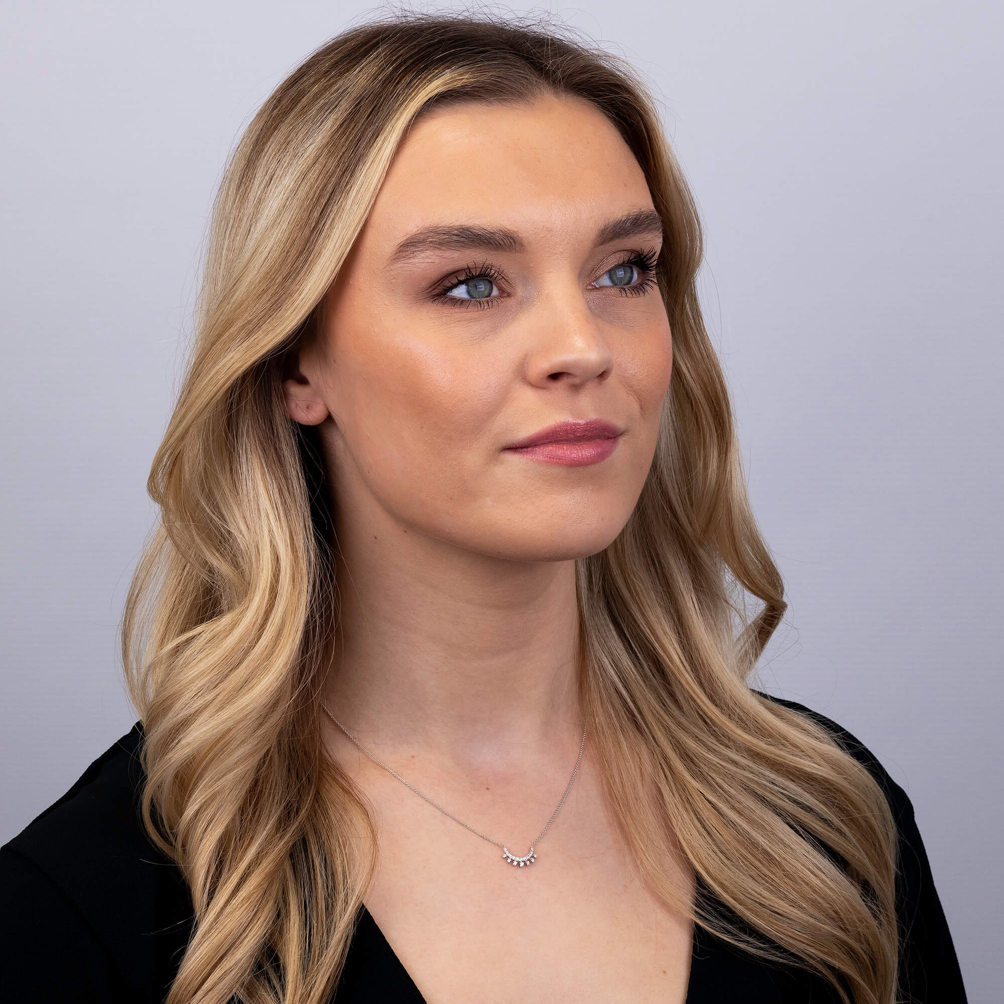 Elevate your jewellery collection with our enchanting 9ct White Gold Diamond Necklace, a masterpiece designed to captivate and inspire. This necklace features a delicate crescent shape, masterfully set with tiny diamonds along its curve and enhanced by outward-facing diamonds resembling moonbeams. Each diamond is expertly placed to catch the light, creating a radiant display reminiscent of a partial mandala, symbolizing unity and eternity. Suspended by an integral chain, the crescent hangs gracefully, offering a sophisticated yet mystical allure. Whether worn as a statement piece or a subtle symbol of cosmic beauty, this diamond crescent necklace is a luxurious addition to any ensemble, promising to enchant and delight.