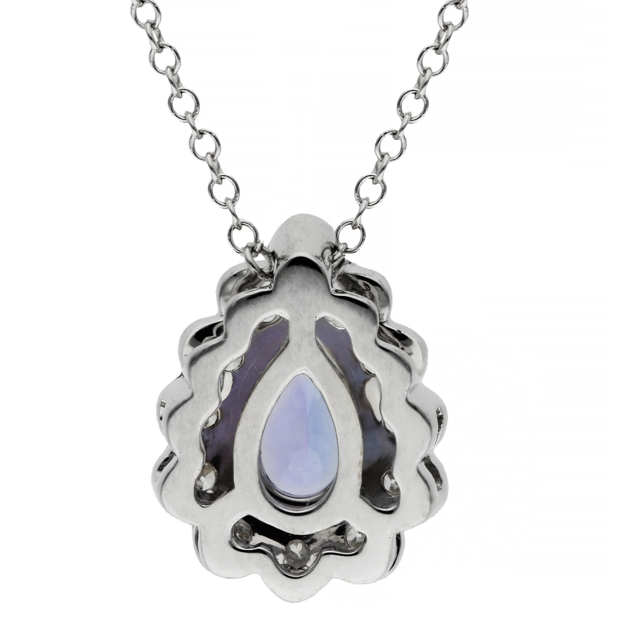 Experience the allure of our 9ct white gold pendant, featuring a captivating 0.45ct pear shaped tanzanite at its centre. This elegant pendant is beautifully accentuated by a frame of brilliant diamonds, which cast a sparkling light around the deep, enchanting blue of the tanzanite. Each diamond is complemented by a milgrain scalloped edge, which adds a sophisticated, decorative touch to the overall design. Complete with a matching white gold chain, this pendant offers a luxurious addition to any jewellery collection. It is perfect for enhancing evening wear or adding a touch of luxury to your everyday outfits. Crafted with precision and care, this tanzanite and diamond pendant is a true masterpiece that showcases exceptional craftsmanship.