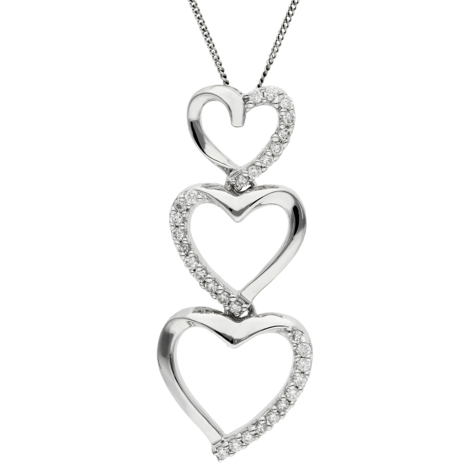 Introducing our exquisite 9ct White Gold Diamond Heart Pendant, a true work of art combining sophistication and design. This elegant necklace showcases a sequence of three hearts, each elegantly formed from radiant 9ct white gold and descending in size. Enhancing the design, diamonds are intricately set along one alternating side of each heart, providing a subtle shimmer and refined appeal. Ideal for the contemporary woman who appreciates a blend of classic beauty with modern design, this heart necklace transitions seamlessly from daytime charm to evening elegance. Whether it's a heartfelt gift or a lavish indulgence for yourself, this gold heart pendant epitomizes style and elegance. With complimentary UK delivery, acquiring this luxurious heart necklace is seamless. Shop today to bring home a piece that embodies love and sophistication, guaranteed to delight and enchant.