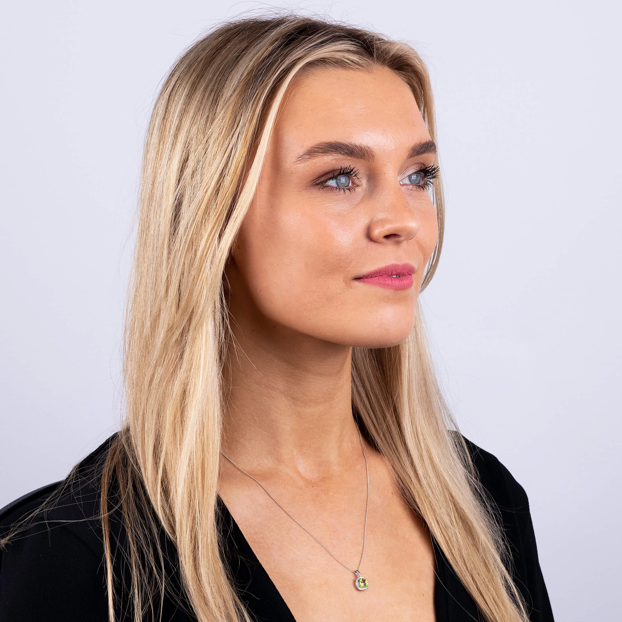 "Discover the allure of our exquisite 9ct White Gold Peridot and Diamond Halo Pendant, a piece that blends modern sophistication with timeless charm. At the centre lies a striking cushion cut peridot, celebrated for its vibrant green shade that embodies renewal and vitality. Surrounding this captivating gemstone is a halo of dazzling diamonds, expertly set to highlight the peridot’s brilliance. The diamonds are nestled in polished white gold, adding a luxurious touch that elevates the pendant’s elegance. This piece is perfect for those who admire contemporary style combined with classic beauty, making it an ideal gift or personal treasure. Whether for daily wear or a special occasion, this pendant brings a unique glow to any look."