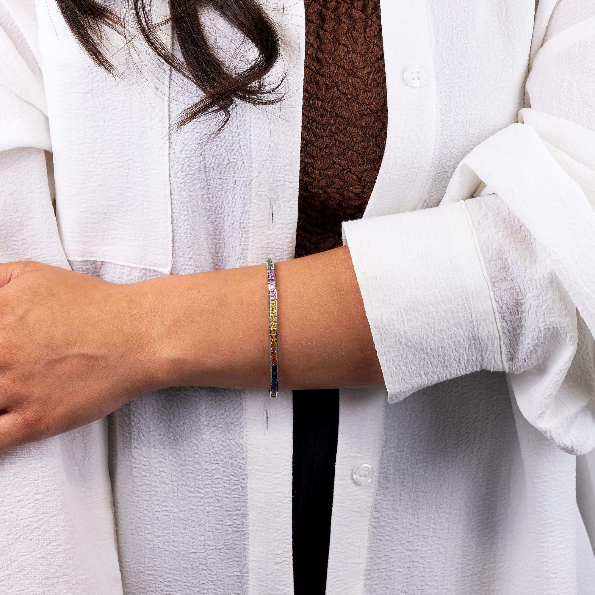 Introduce a burst of colour to your wardrobe with our stunning 9ct White Gold Rainbow Sapphire Tennis Bracelet. This exquisite piece is beautifully crafted with square cut sapphires, each precisely set in a channel setting to create a seamless rainbow effect. The cool tones of the 9ct white gold perfectly complement the vivid colours of the sapphires, making it a striking and fashionable choice for any occasion. Ideal as a thoughtful gift for a Sapphire anniversary or a September birthday, this bracelet offers both brilliance and sentimental value, ensuring it will be cherished for years to come.