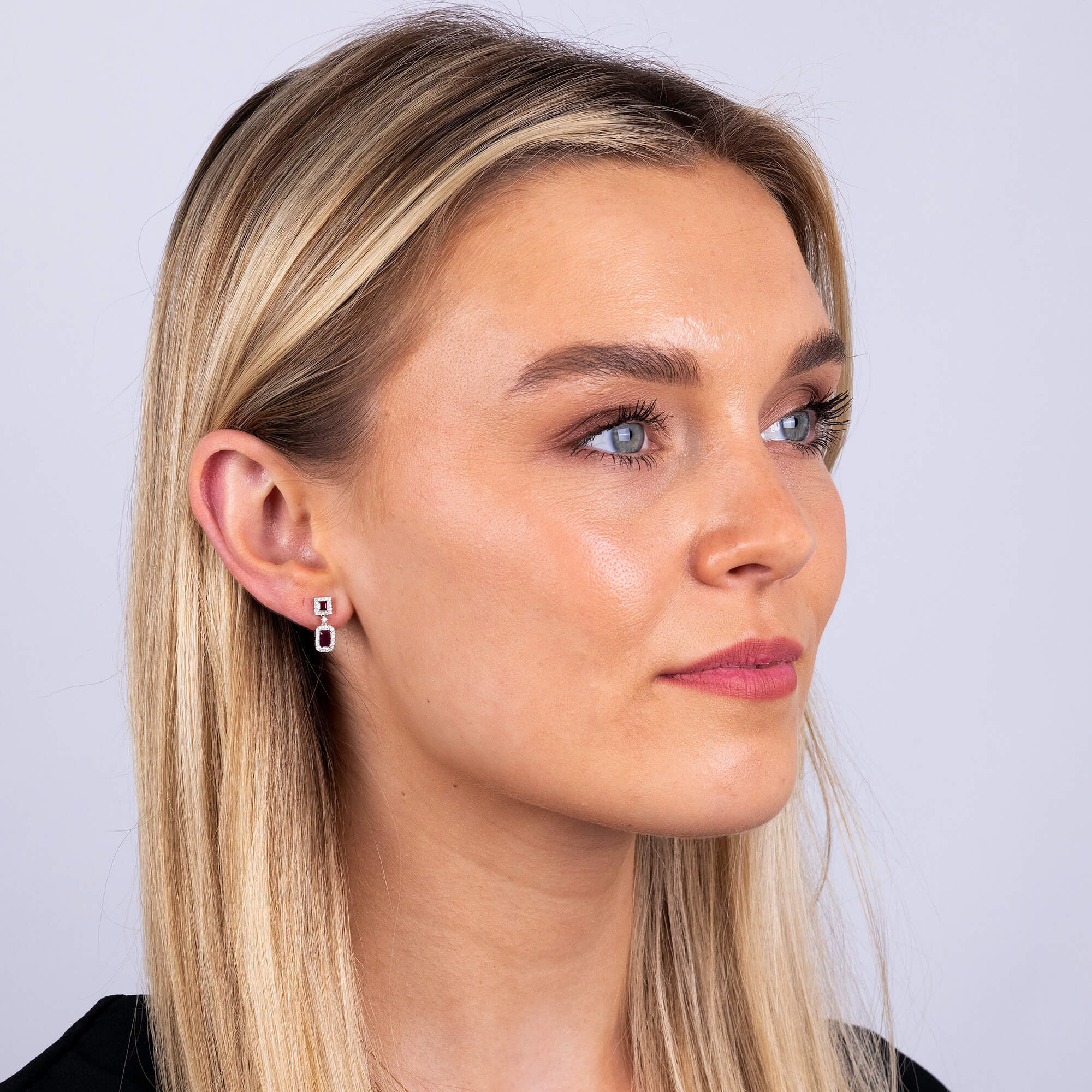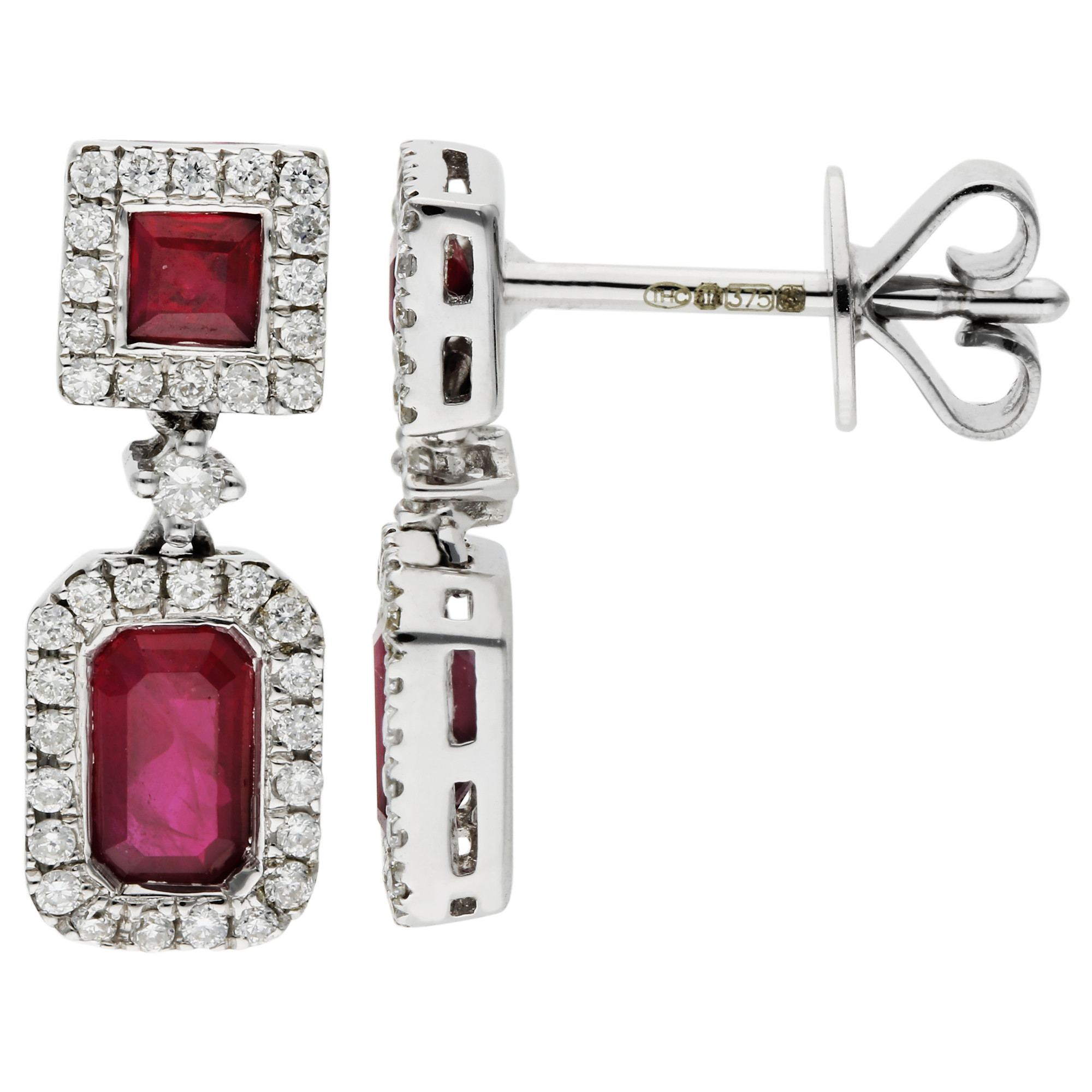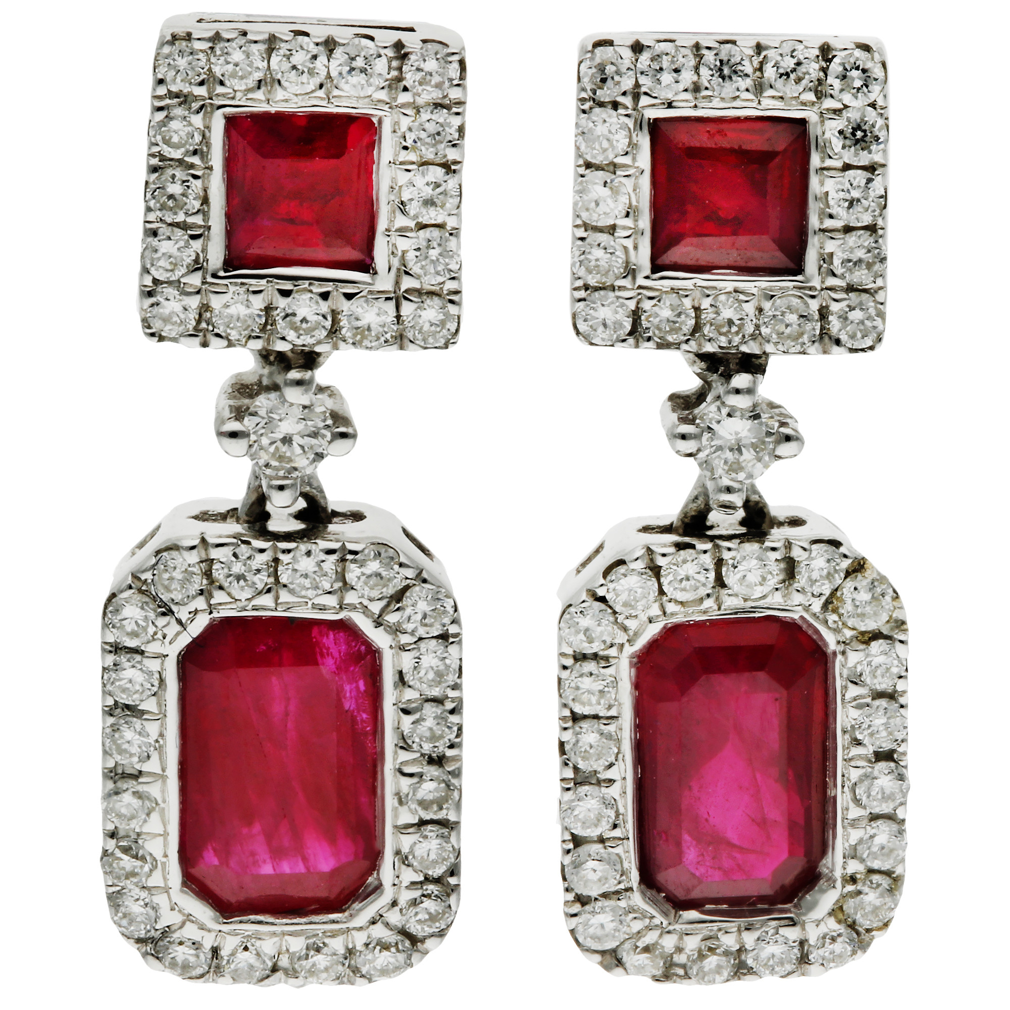 Elevate your elegance with our 9ct White Gold Diamond & 0.92ct Ruby Earrings, where luxury meets classic design. These stunning earrings showcase a square-cut ruby surmount, each encircled by a dazzling halo of diamonds, enhancing the vibrant red hue. Beneath, a rectangular-cut ruby, similarly framed by diamonds, adds depth and grandeur, with an additional small diamond gracefully positioned in between for a touch of exquisite detail.