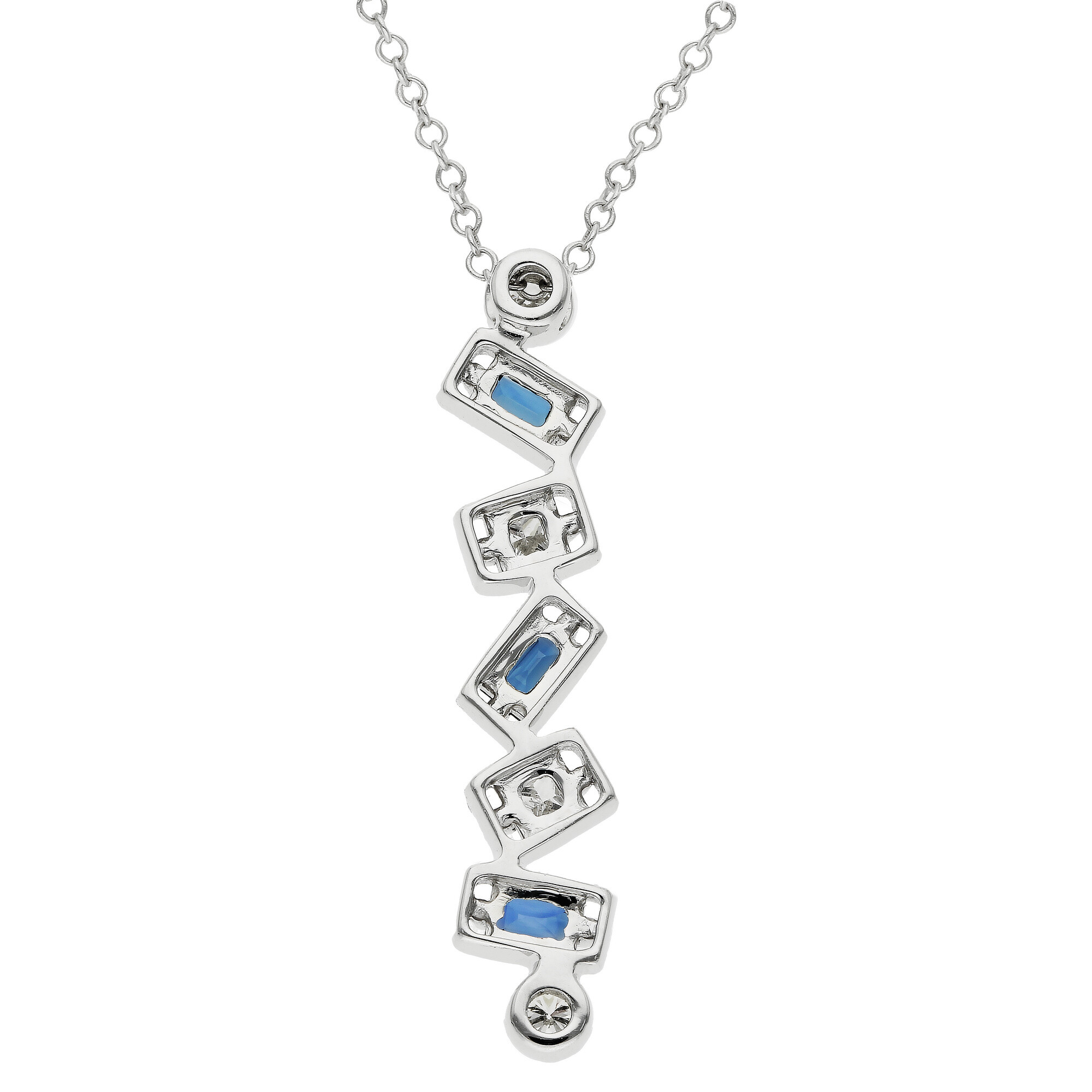 Celebrate sophistication and colour with this exquisite 9ct white gold sapphire necklace. Designed with a modern eye, the pendant features a sleek vertical bar adorned with alternating sapphires and diamonds. Rectangular cut sapphires are set at varied angles to reflect the light in a unique and eye catching way, while round and princess cut diamonds are nestled between, offering brilliant contrast and sparkle. The white gold setting enhances the cool tones of both stones, creating a refined and polished look that is perfect for both day and evening wear. The necklace is completed with an 18 inch adjustable chain, giving flexibility for styling with different outfits and necklines. Ideal as a meaningful gift for a loved one or as a special addition to your own jewellery collection, this necklace blends traditional gemstones with a bold and stylish design. A perfect expression of elegance with a contemporary twist.