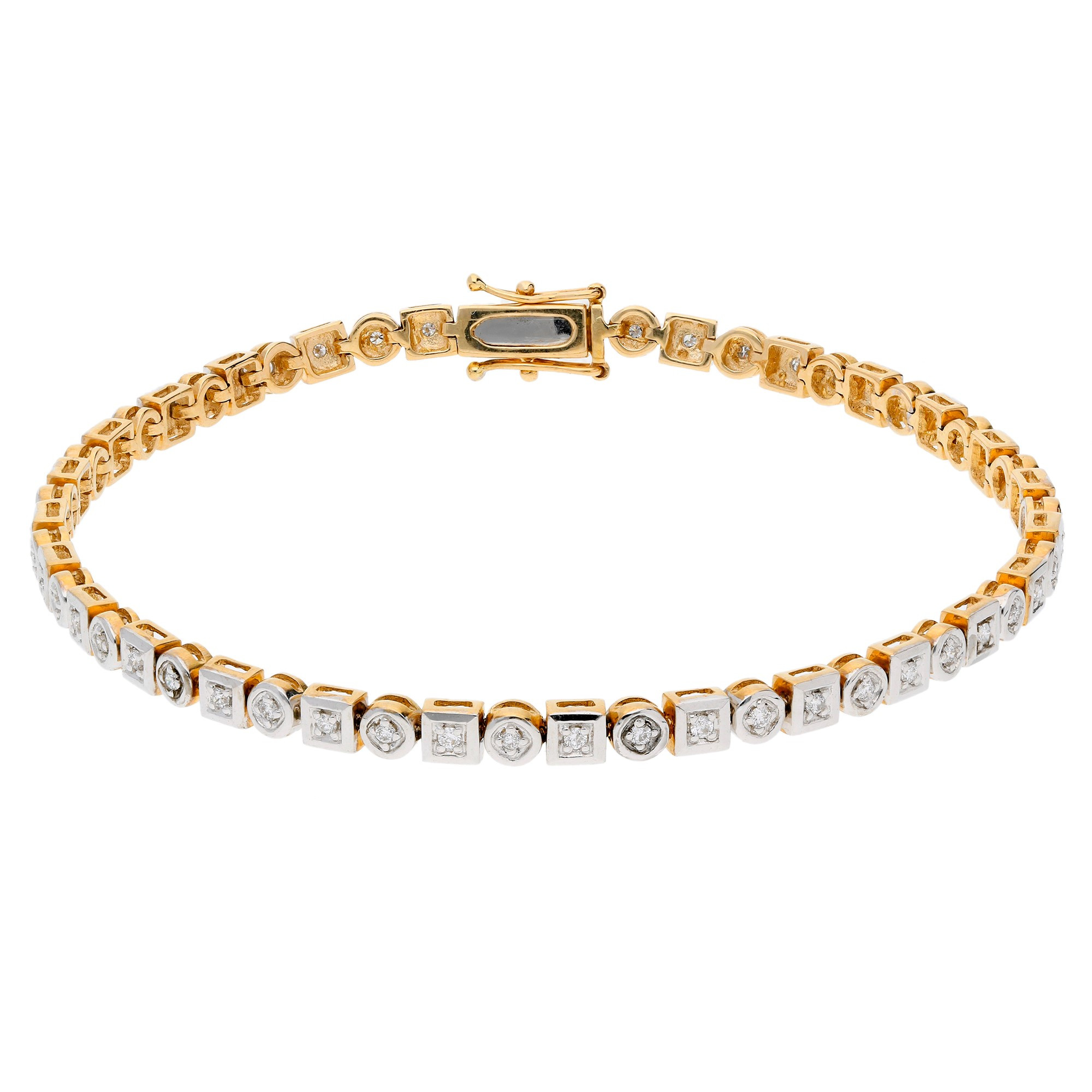Introducing our 9ct Yellow Gold 0.52ct Diamond Tennis Bracelet, an exquisite piece that combines classic charm with contemporary flair. Crafted with precision, this bracelet showcases round brilliant cut diamonds, each nestled in a beautifully alternating square and round setting. This creates a captivating geometric pattern that enhances the bracelet's overall appeal. Perfect for wearing at any event, it adds a sophisticated sparkle to your attire. A fabulous gift idea for celebrating special occasions, this tennis bracelet is sure to be cherished by anyone who receives it, making every moment memorable with its luxurious and stylish design.