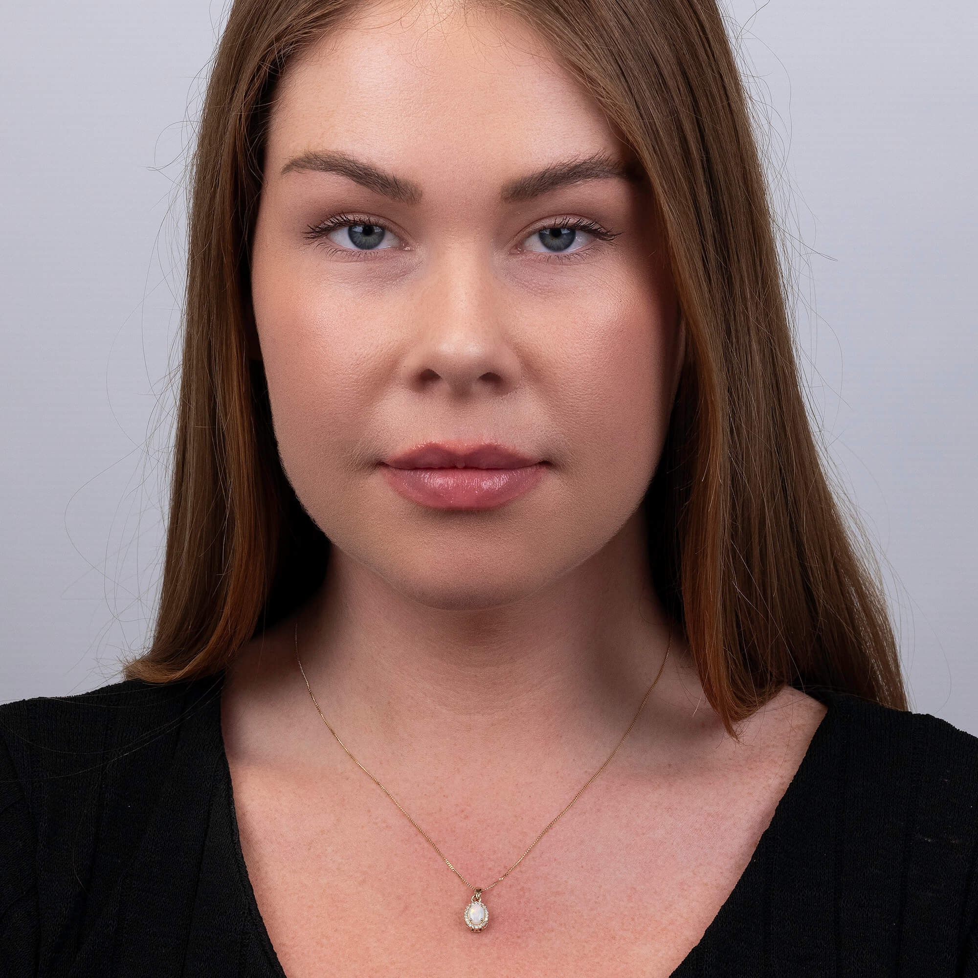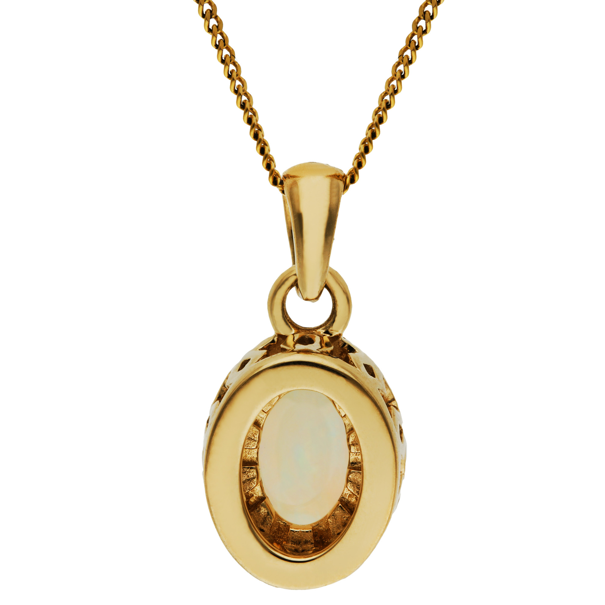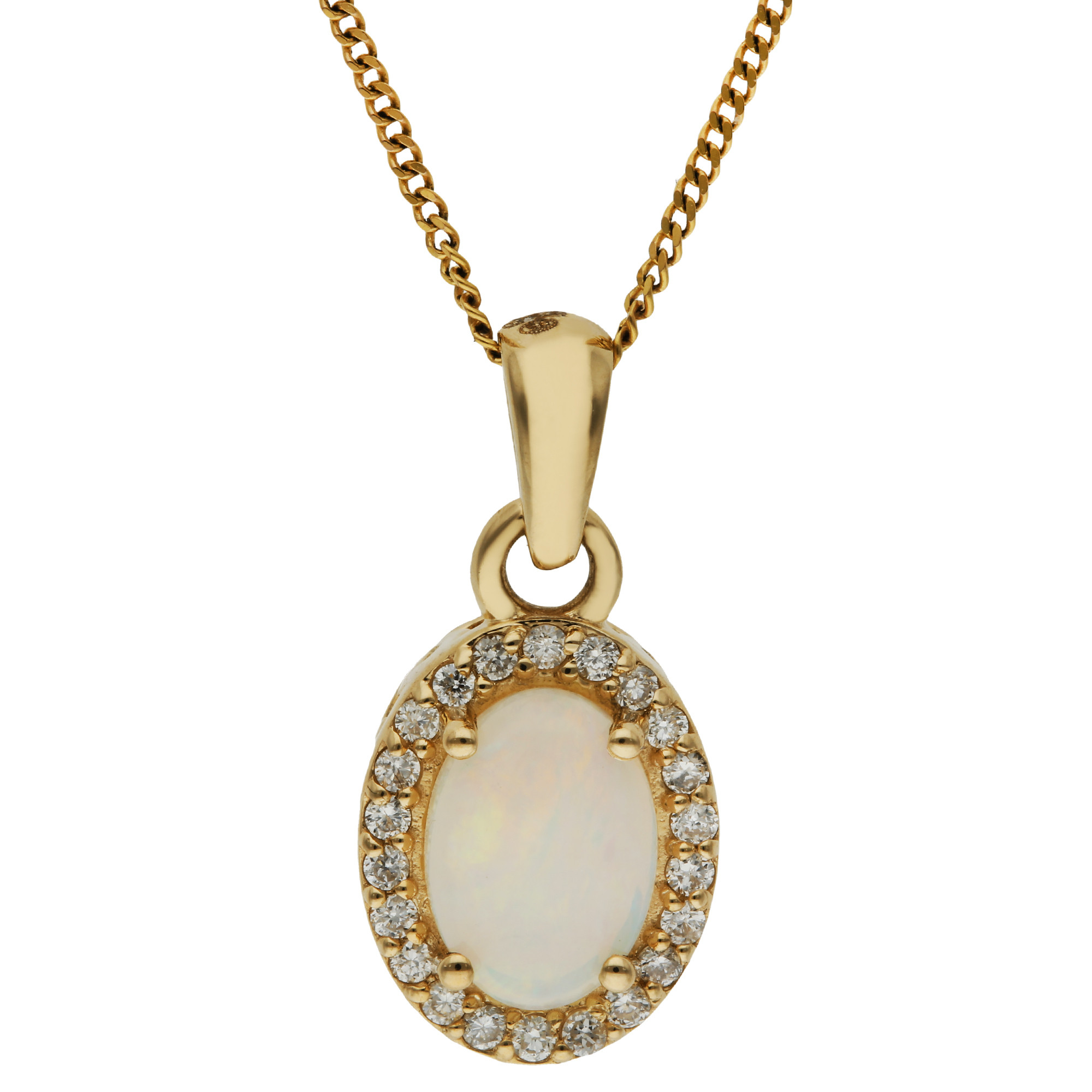 Discover the delicate charm of our 9ct yellow gold pendant, graced with a 0.60ct oval opal cabochon at its centre. This pendant captivates with the opal's vibrant colour play, surrounded by a halo of finely cut diamonds that add a touch of brilliance to its overall appearance. The pendant dangles from a sleek, polished bail and comes with a matching chain, presenting a sophisticated piece that transitions effortlessly from day to night. Ideal for anyone looking to enhance their jewellery wardrobe with something truly special, this opal pendant embodies both luxury and the enchanting mystery of one of nature's finest creations.