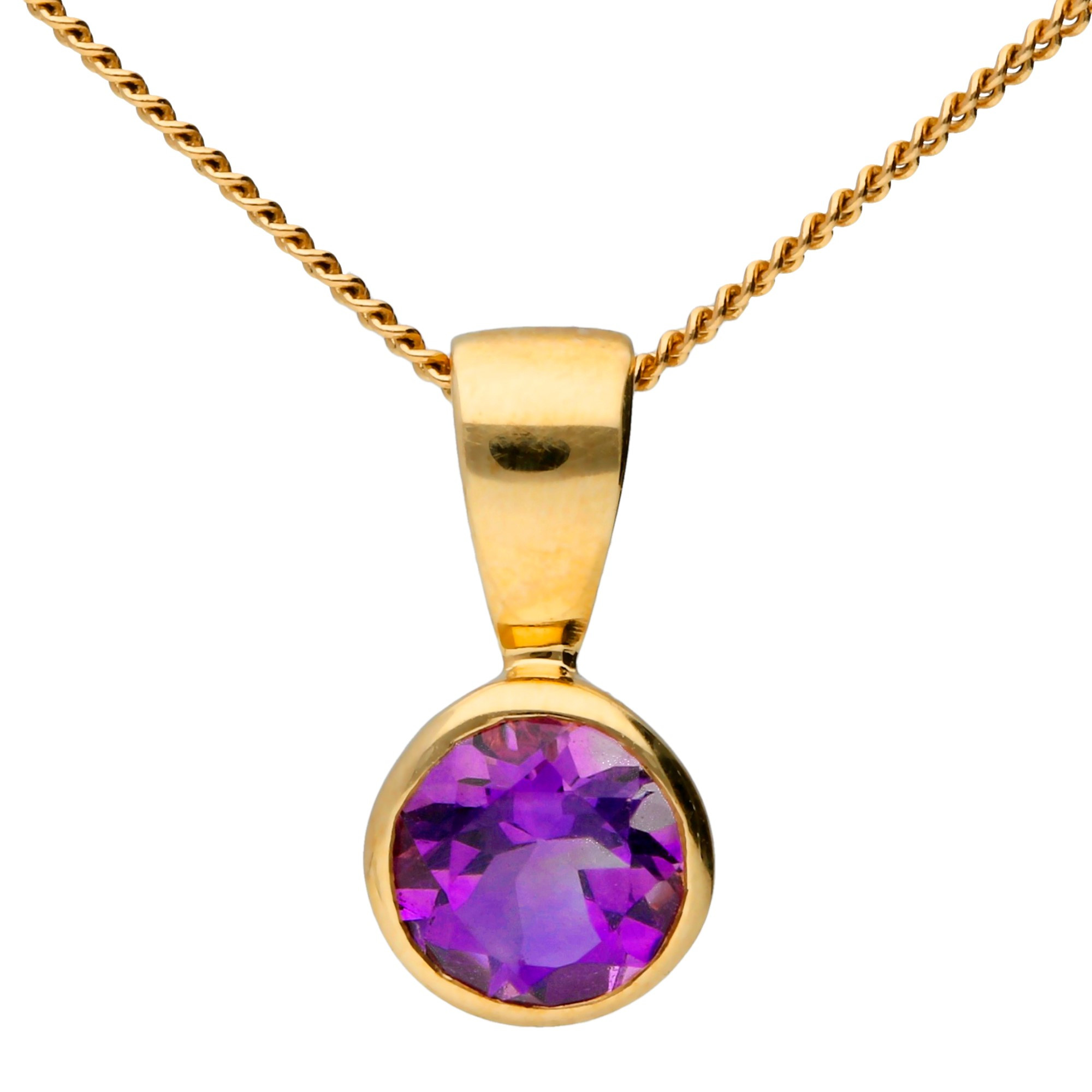 Discover the elegance of our 9ct Yellow Gold Amethyst Pendant, a classic piece designed to capture attention with its captivating gemstone. The pendant features a 0.45ct round amethyst, securely bezel set to reveal the gemstone’s rich purple colour against the warm tones of yellow gold. The fixed polished bail and matching gold chain complete the look, ensuring this pendant hangs beautifully at the collarbone. Ideal for adding a subtle yet sophisticated splash of colour, this amethyst pendant is versatile enough to enhance both casual and formal wear. Whether given as a meaningful gift or a personal addition to your collection, this pendant brings together timeless design and the striking beauty of amethyst, making it a truly cherished piece.