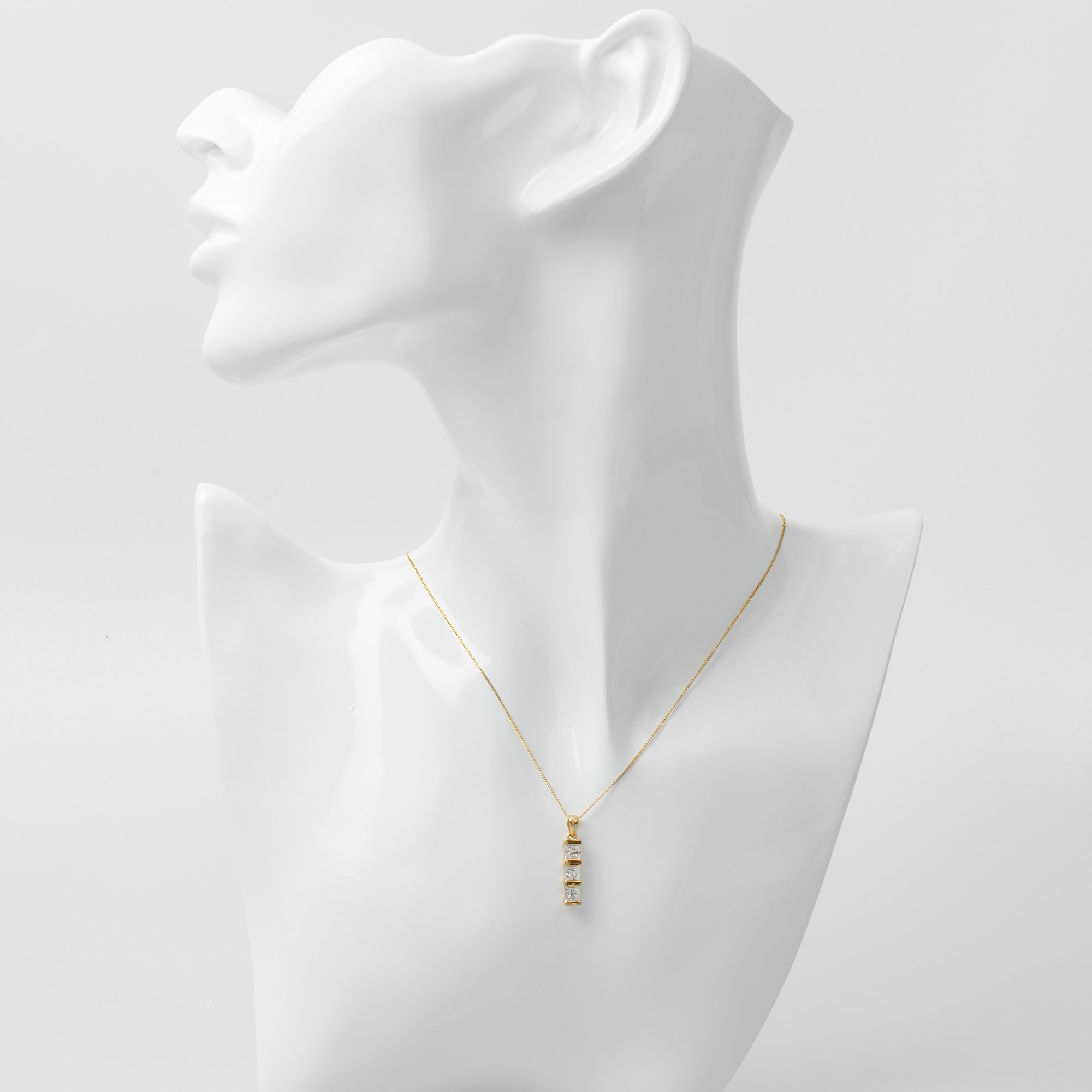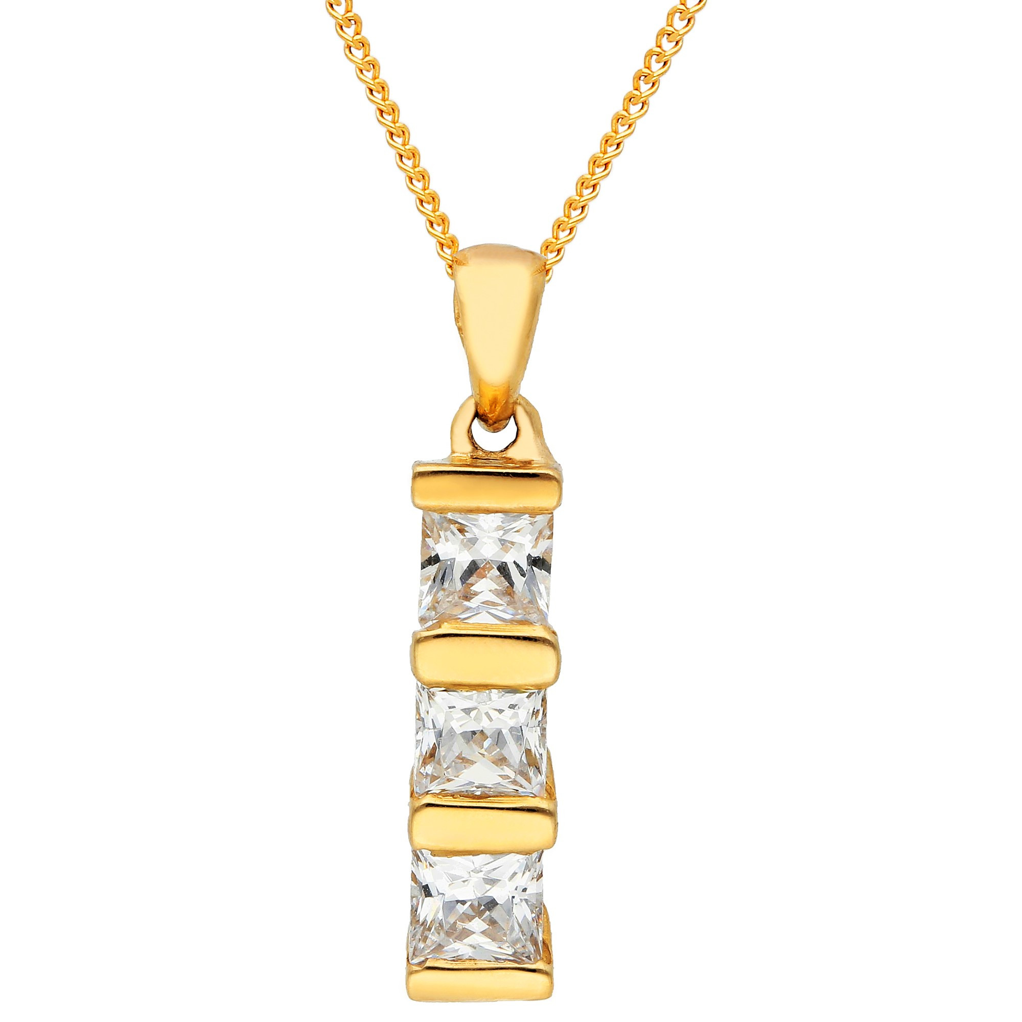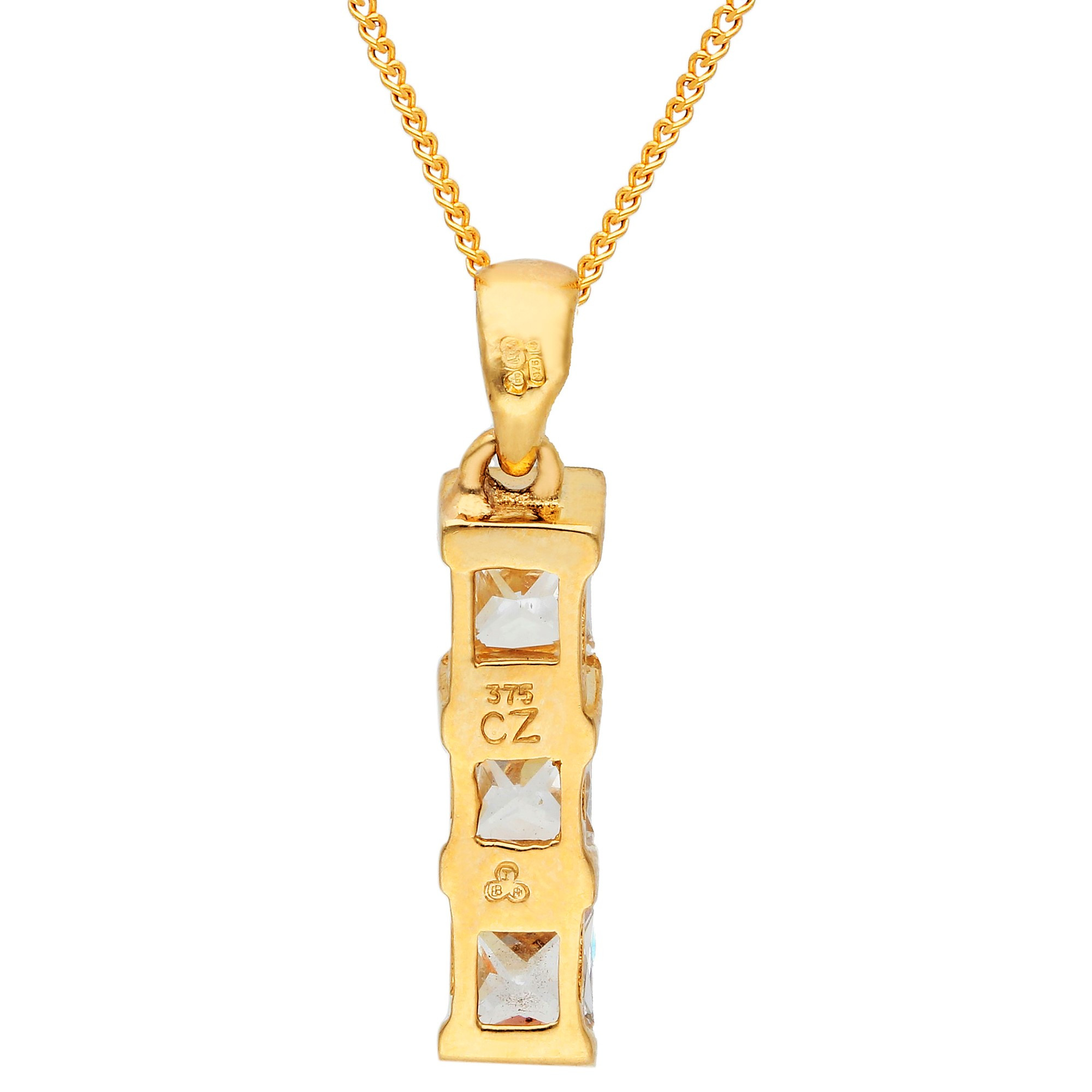 Introducing our chic Cubic Zirconia & 9ct Yellow Gold Pendant, a perfect blend of sophistication and modern design. This pendant boasts a slender bar drop silhouette, accented with three square cut cubic zirconias that add a dazzling touch to the minimalist design. Each stone is expertly inset within the polished yellow gold bar, reflecting light beautifully and offering an eye catching sparkle. The pendant hangs gracefully from a durable curb chain, adding a refined touch to any outfit. Available in various chain lengths, which you can choose from the dropdown menu, this pendant adapts effortlessly to any style preference. Ideal for those seeking a piece that combines timeless elegance with contemporary charm, this pendant is sure to be a treasured addition to any jewellery collection.