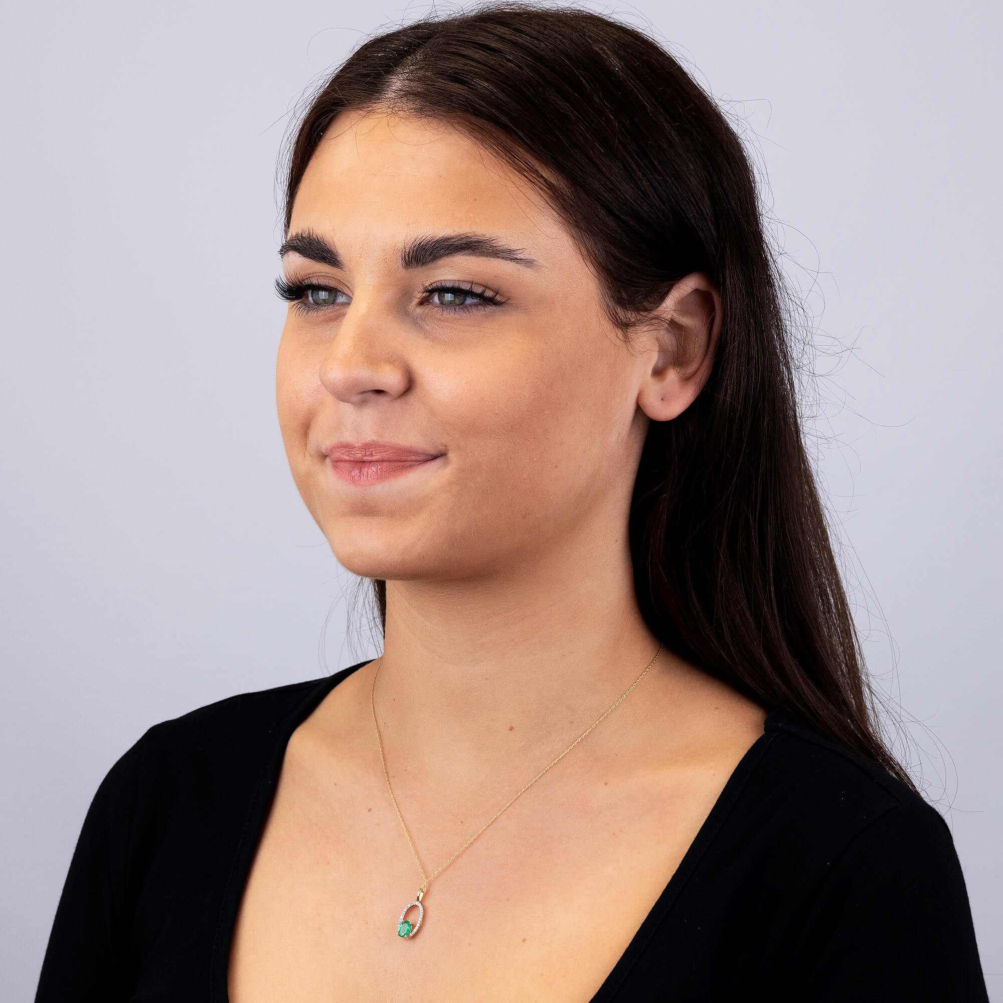Discover the allure of our 9ct Yellow Gold Diamond & Emerald Pendant, a sophisticated piece that blends timeless elegance with a hint of contemporary flair. At the heart of this pendant lies a vibrant 0.58ct oval cut emerald, nestled within an oval of meticulously set tiny diamonds. The emerald's deep green colour symbolizes growth and renewal, while the surrounding diamonds add a dazzling frame that elevates the gemstone's natural beauty. This pendant hangs gracefully from a polished bail on a sleek gold chain, making it a versatile and stylish choice for both daytime sophistication and evening glamour. Whether as a thoughtful gift or a treat for yourself, this diamond and emerald pendant promises to be a cherished addition to any jewellery collection.
