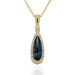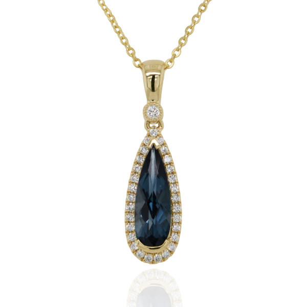 Discover the allure of our 9ct yellow gold diamond and London Blue topaz pendant, designed to captivate and charm. Featuring a 1.00ct elongated pear shaped topaz, encased in a radiant halo of diamonds, this pendant exudes sophistication. The topaz's vivid blue tones are beautifully highlighted by the surrounding diamonds, creating a stunning visual contrast. The piece is elegantly held by a diamond-encrusted bail and is completed with a sleek yellow gold chain, making it ready to wear for any event. Whether you're attending a formal gathering or enhancing your daily wardrobe, this pendant is an exceptional choice for those who value elegance and a touch of dramatic flair in their jewellery.