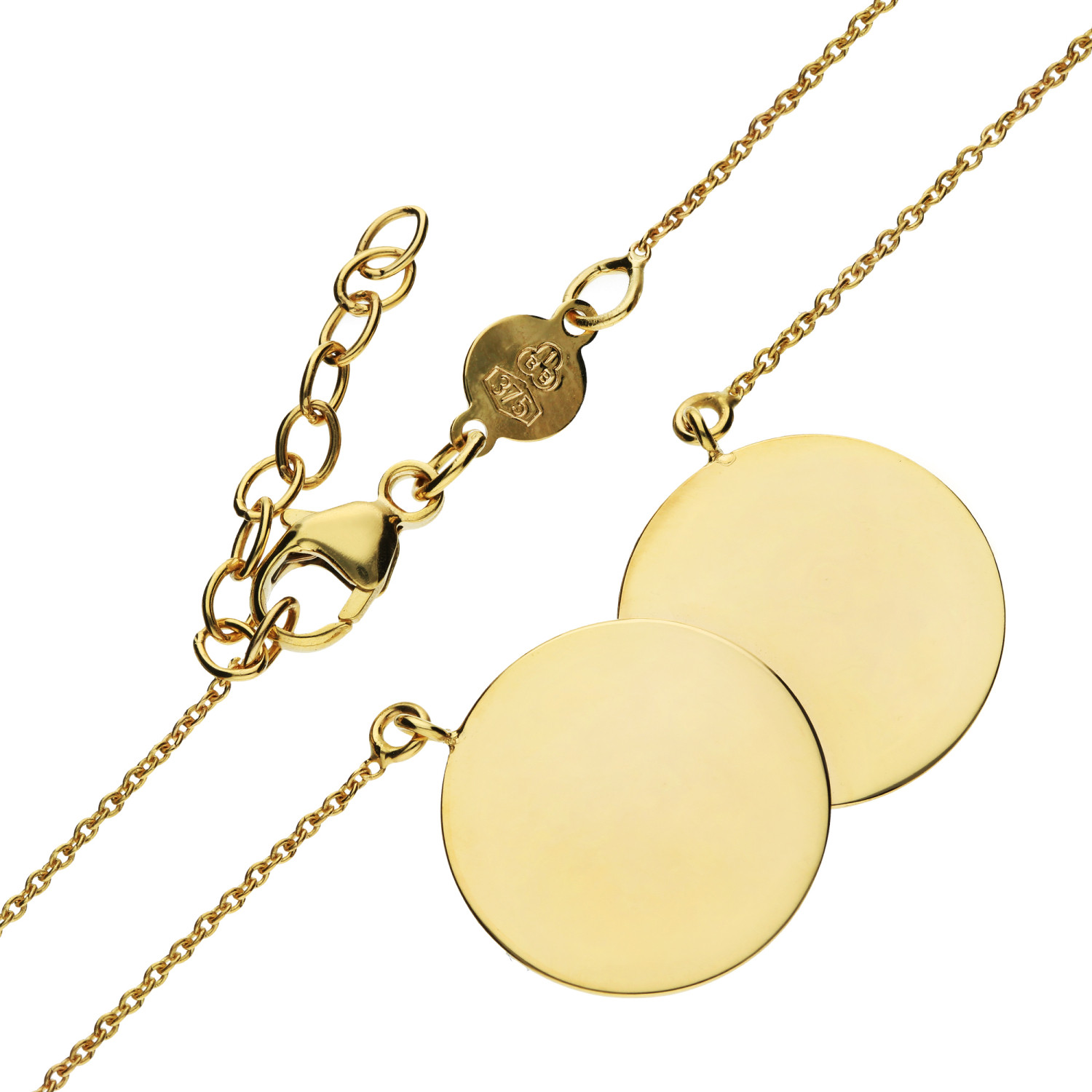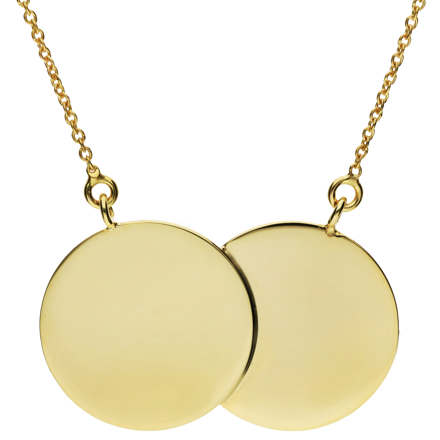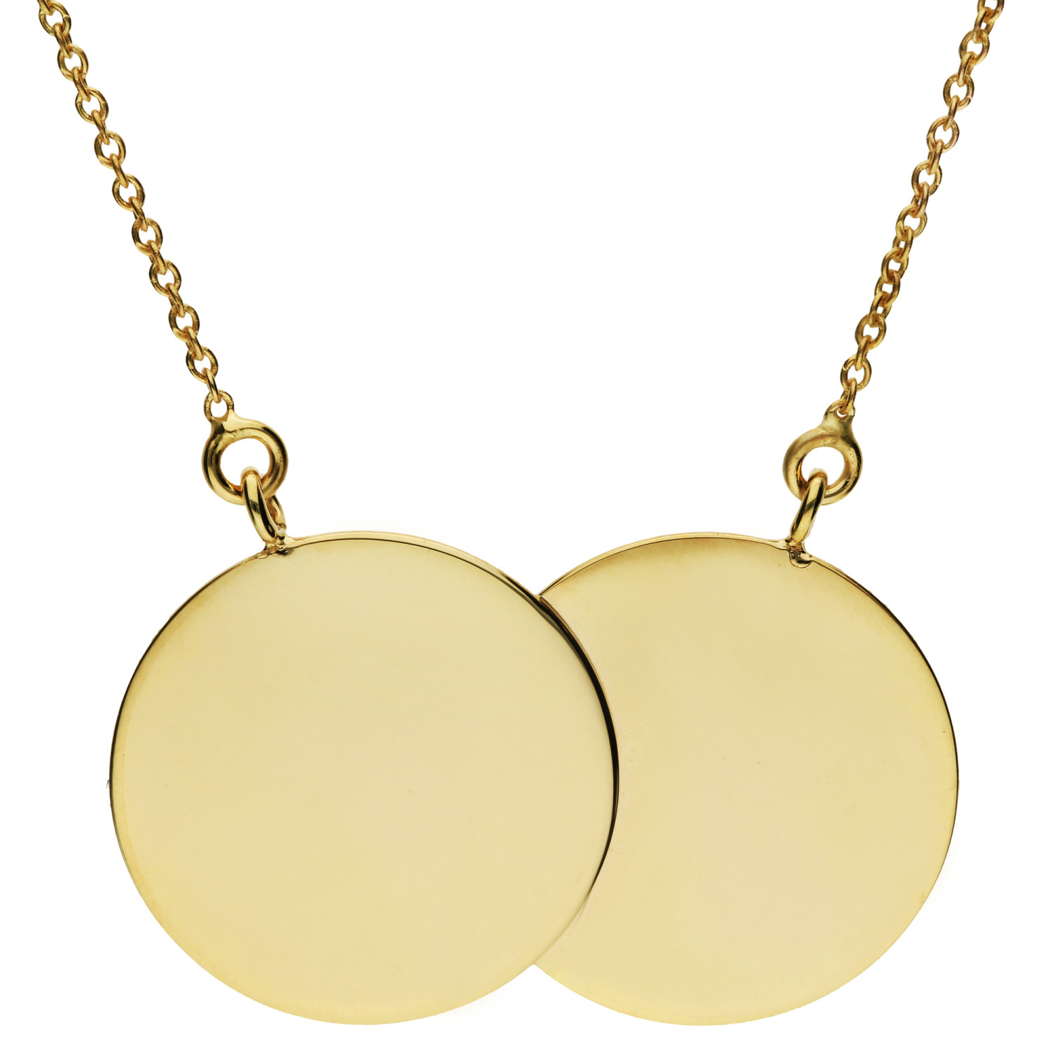 Discover the charm of personalised jewellery with our 9ct Yellow Gold Disc Necklace, featuring two beautifully crafted, overlapping discs in luxurious yellow gold. The highly polished finish of each disc gives this necklace a radiant shine, making it an eye-catching yet versatile piece. With its smooth surfaces, this necklace is perfect for engraving, allowing you to create a personal statement with initials, dates, or words that hold special meaning. Designed with an integral chain, it sits gracefully at the neckline and adds a touch of elegance to any ensemble. Ideal for both gifting and personal wear, this disc necklace offers a modern take on classic gold jewellery, providing a unique way to carry cherished memories close to your heart.
