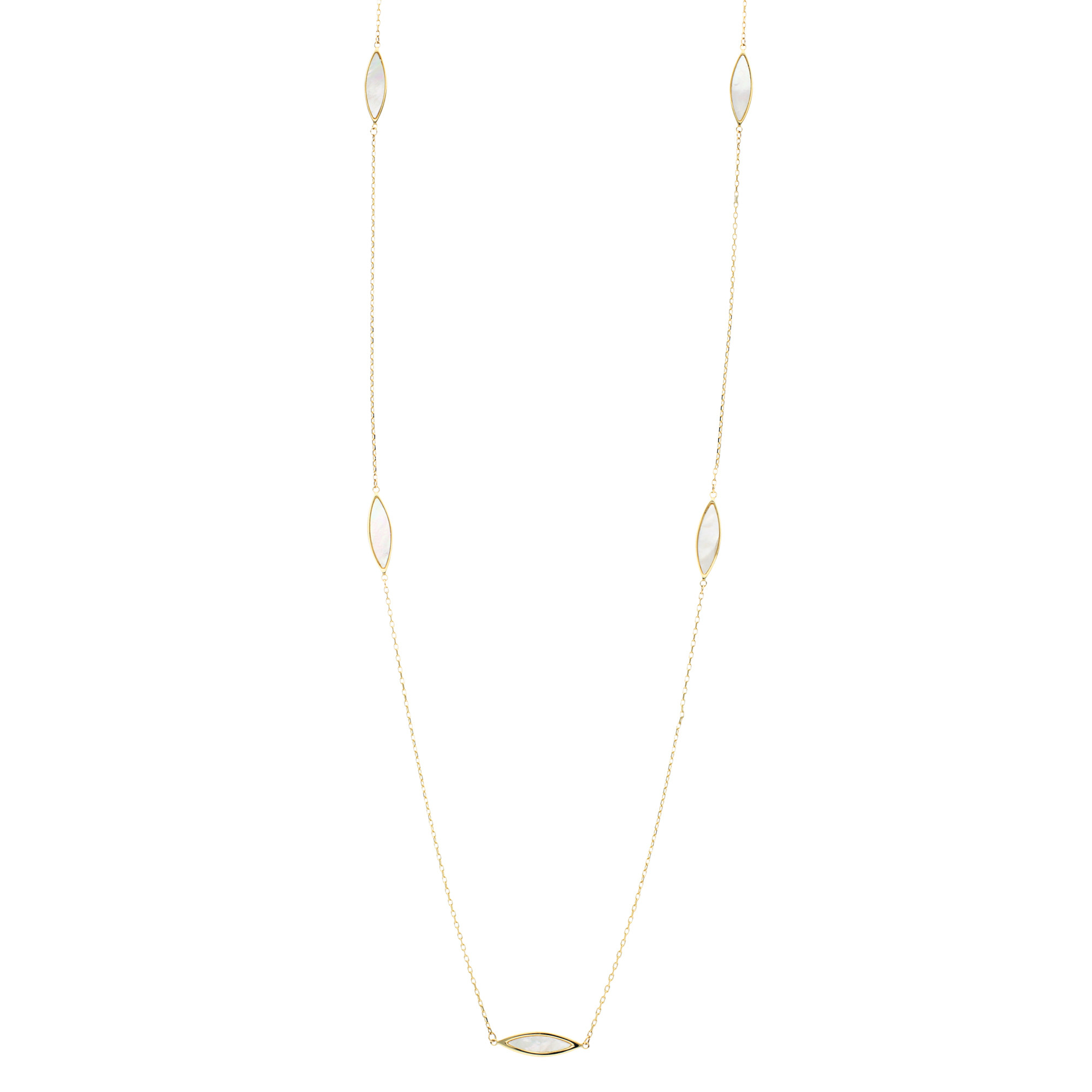 Experience the refined beauty of our 9ct Yellow Gold Mother of Pearl Necklace, an elegant piece crafted to enhance any outfit. Featuring navette shaped mother of pearl panels, each surrounded by smooth yellow gold, this necklace exudes sophistication and grace. The lustrous mother of pearl panels are linked by delicate sections of gold chain, creating a 30 inch necklace that drapes effortlessly. The radiant glow of mother of pearl combined with the warmth of yellow gold gives this piece a timeless appeal, perfect for both day and evening wear. Whether as a striking standalone piece or paired with other favourites, this necklace makes a versatile addition to any collection. With its unique blend of classic and contemporary charm, this necklace is a lovely gift or a special treat that will be treasured for years to come.