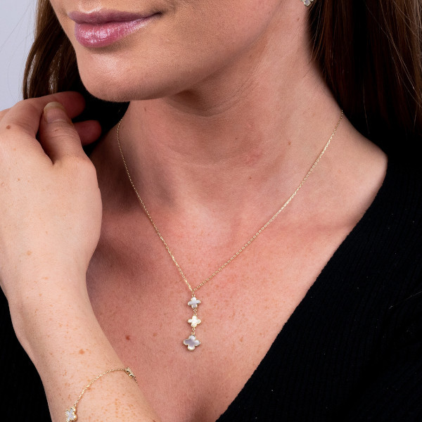 Add a touch of elegance to your jewellery collection with this stunning 9ct Yellow Gold Mother of Pearl Necklace. This piece is designed with a fine yellow gold chain that gracefully leads to a trio of mother of pearl quatrefoil shapes, each framed in polished gold. The three shapes are linked together to form a delicate drop pendant, allowing the natural beauty of mother of pearl to shine. Ideal for any occasion, this necklace adds a touch of refinement to casual outfits and a classic elegance to evening wear. The soft iridescent hues of mother of pearl blend harmoniously with the warm glow of yellow gold, creating a necklace that is both versatile and luxurious. A secure clasp ensures a comfortable fit, making it a cherished piece for years to come.