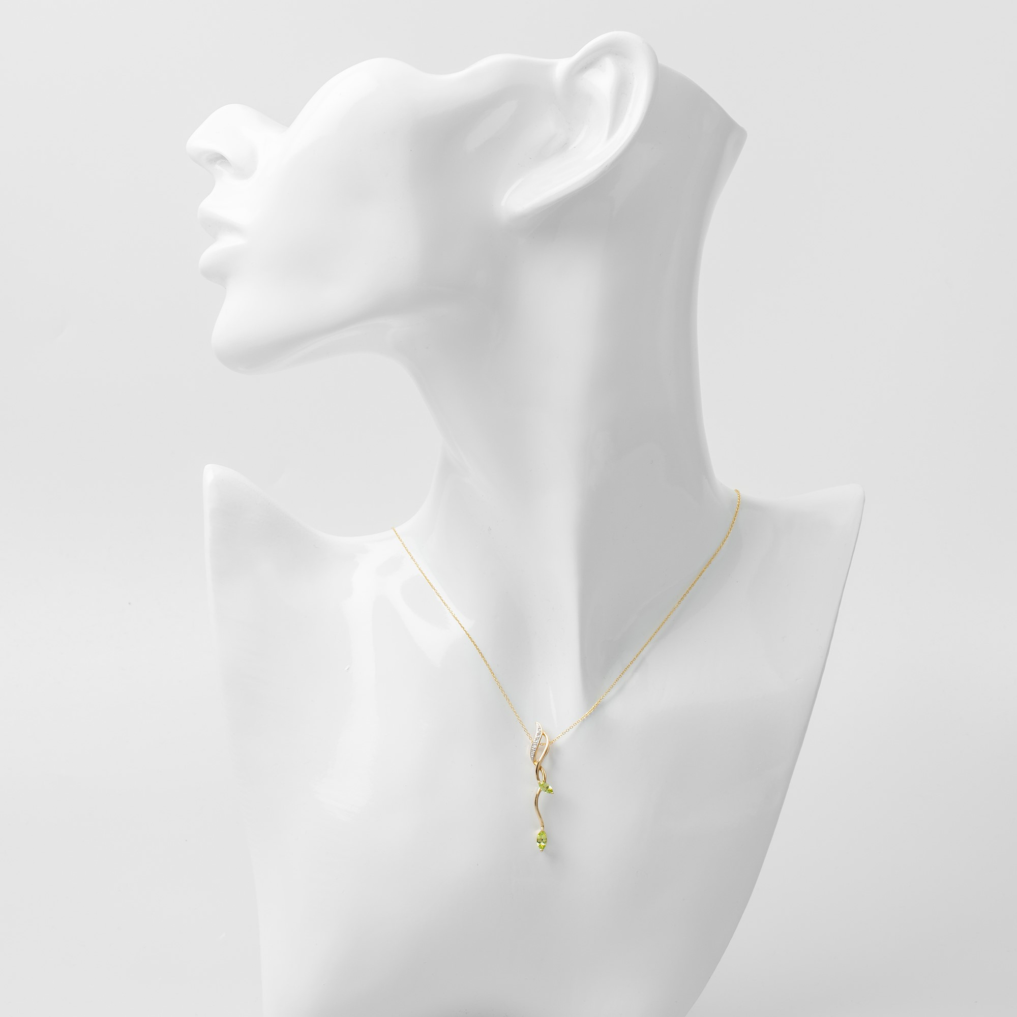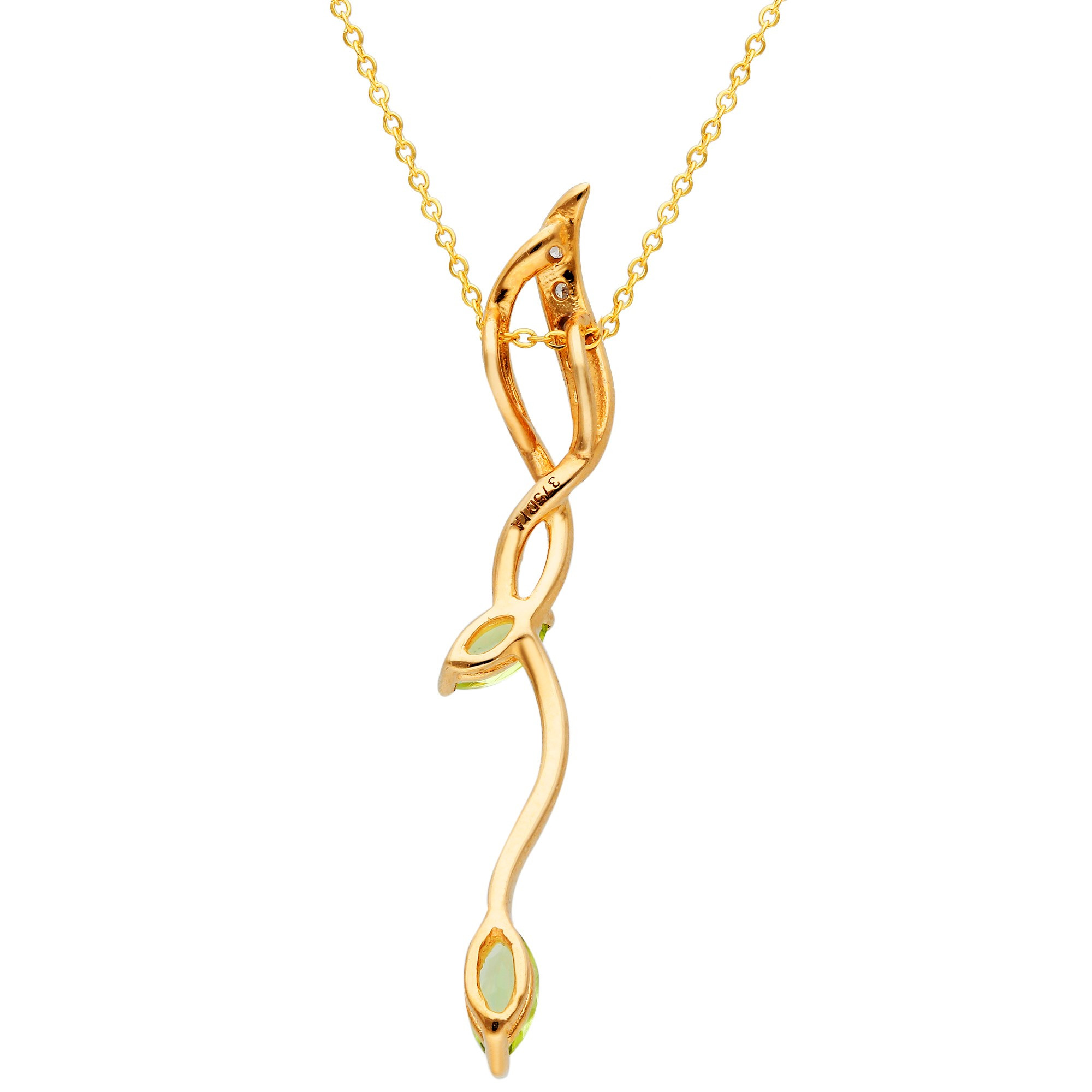 Introducing our enchanting 9ct Yellow Gold Diamond & Peridot Pendant, inspired by the lush vibrancy of nature. This exquisite piece features a beautifully crafted cascading vine in yellow gold, adorned with two marquise cut peridot buds. Each peridot, totalling 0.41 carats, sparkles with a lively green hue, reminiscent of new spring growth. Accentuated by a smattering of tiny diamonds that add a touch of sparkle akin to morning dew, this pendant captures the essence of elegance. It comes complete with a chain, available in your choice of length from the dropdown menu, making it a versatile addition to any jewellery collection. Perfect for those who cherish unique, nature-inspired designs, this pendant is a delightful way to brighten your ensemble.