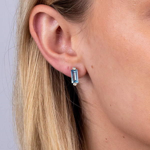 Add a splash of colour to your jewellery collection with our 9ct Yellow Gold Diamond & 3.70ct Swiss Blue Topaz Earrings, perfect for women who love elegant statement pieces. Each stud earring features a vertical rectangular cut Swiss blue topaz, totalling 3.70ct, accentuate by a bezel set diamond at each end. Crafted from high quality 9 carat yellow gold, these earrings offer a beautiful contrast between the bright blue topaz and the sparkling diamonds. The posts and scroll backs provide a secure and comfortable fit, making these earrings ideal for both everyday wear and special occasions. The combination of radiant diamonds and vibrant topaz creates a stunning visual effect that enhances any outfit. Whether as a gift for a loved one or a special treat for yourself, these earrings are sure to be treasured. Embrace the elegance and brilliance of these captivating diamond and topaz earrings and make a lasting impression.