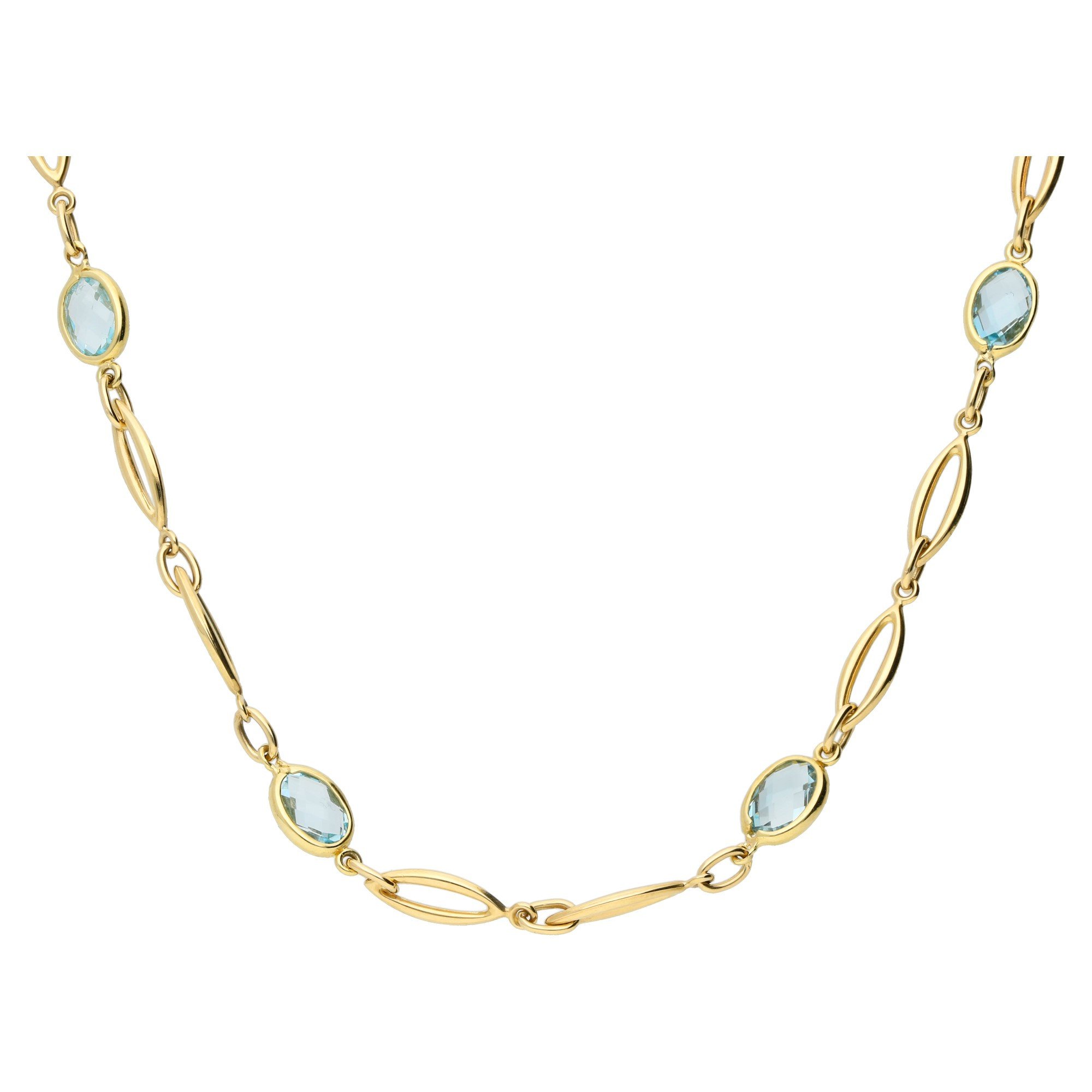 Discover the delicate beauty of our 9ct yellow gold topaz necklace, designed to dazzle and charm. This exquisite necklace is adorned with oval faceted topaz stones, each set in a secure bezel setting, adding a touch of serene blue to the warm glow of yellow gold. The elliptical chain links offer a smooth, comfortable fit and a seamless look, making it an ideal accessory for both casual and formal occasions. The luminous blue topaz not only enhances the necklace's visual appeal but is also believed to bring joy and abundance to the wearer. This versatile piece is a fabulous way to treat yourself or someone special, ensuring a sparkling presence in any jewellery collection.