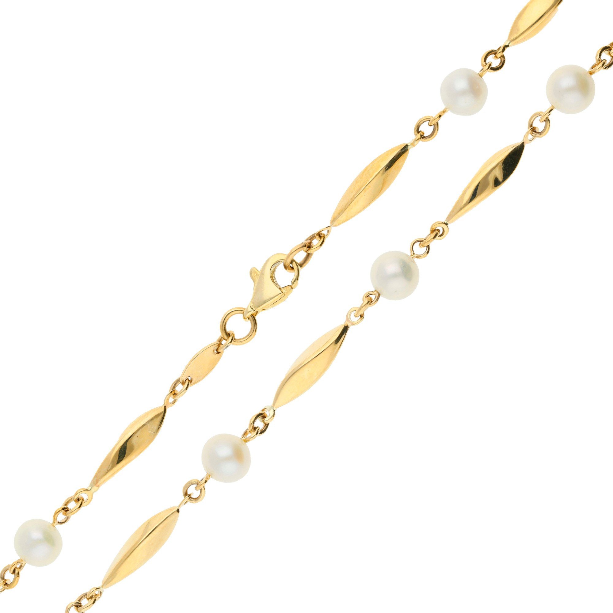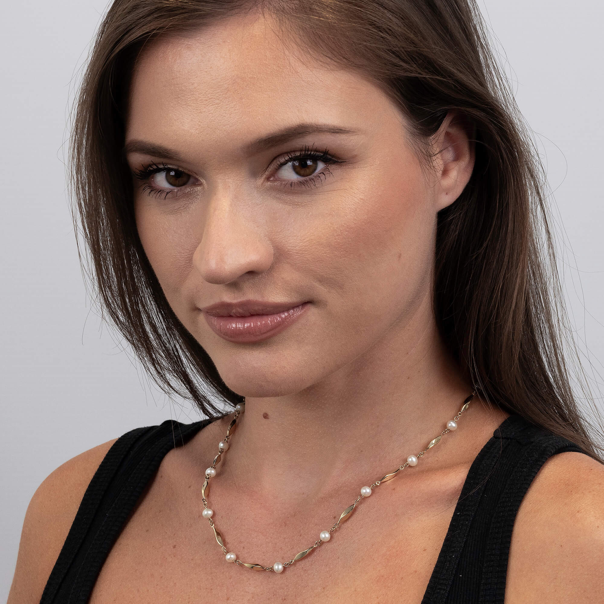 Presenting our stunning 9ct Yellow Gold Wave Link Pearl Necklace, a beautiful blend of modern design and classic sophistication. This necklace features elongated, rhombus-shaped gold links, each artfully twisted to form a captivating wave pattern. The warm glow of the gold catches the light with every move, creating a dazzling effect. Interspersed between these intricate gold links are lustrous round cultured pearls, adding a timeless elegance to the piece. The contrast between the shimmering gold and the smooth pearls creates a striking balance of contemporary flair and traditional charm. Perfect for any occasion, this necklace combines innovative craftsmanship with enduring beauty, making it a treasured addition to any jewellery collection. Whether as a statement piece for a special event or a luxurious everyday accessory, this wave link pearl necklace exudes sophistication and style.