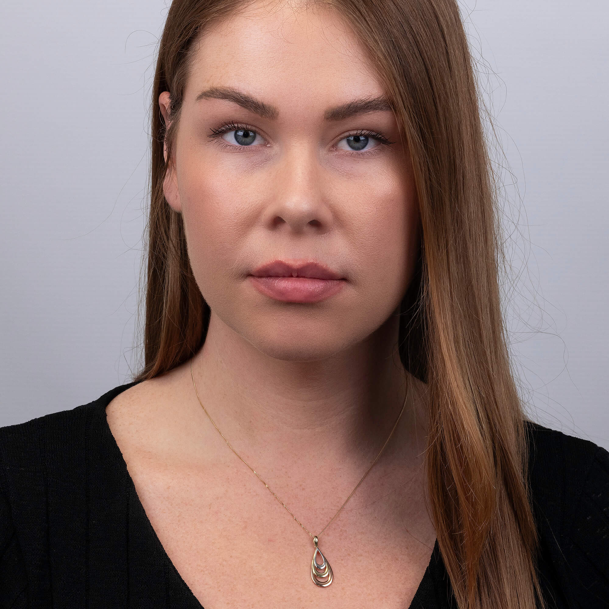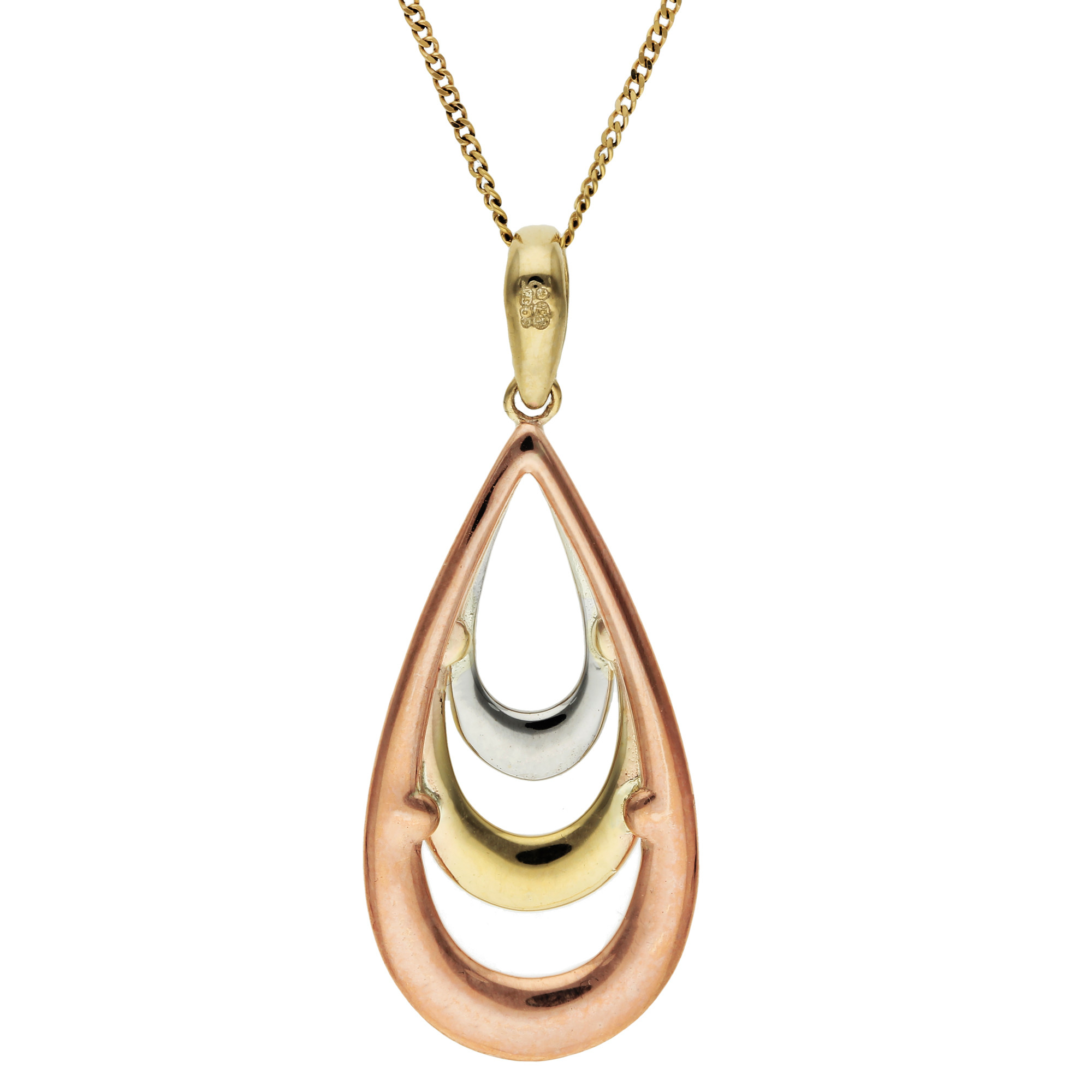 Elevate your style with our 9ct Rose, White, and Yellow Gold Triple Teardrop Pendant, a stunning piece that combines the best of three precious metals. The three concentric teardrop shapes in white, yellow, and rose gold add depth and dimension to this design, making it a unique addition to any jewellery collection. Suspended from a polished yellow gold bail, this pendant comes with a matching yellow gold chain, allowing you to select the perfect length from the dropdown menu. This pendant is a versatile accessory that can be worn daily or reserved for special occasions, adding a contemporary edge with timeless appeal to any ensemble.