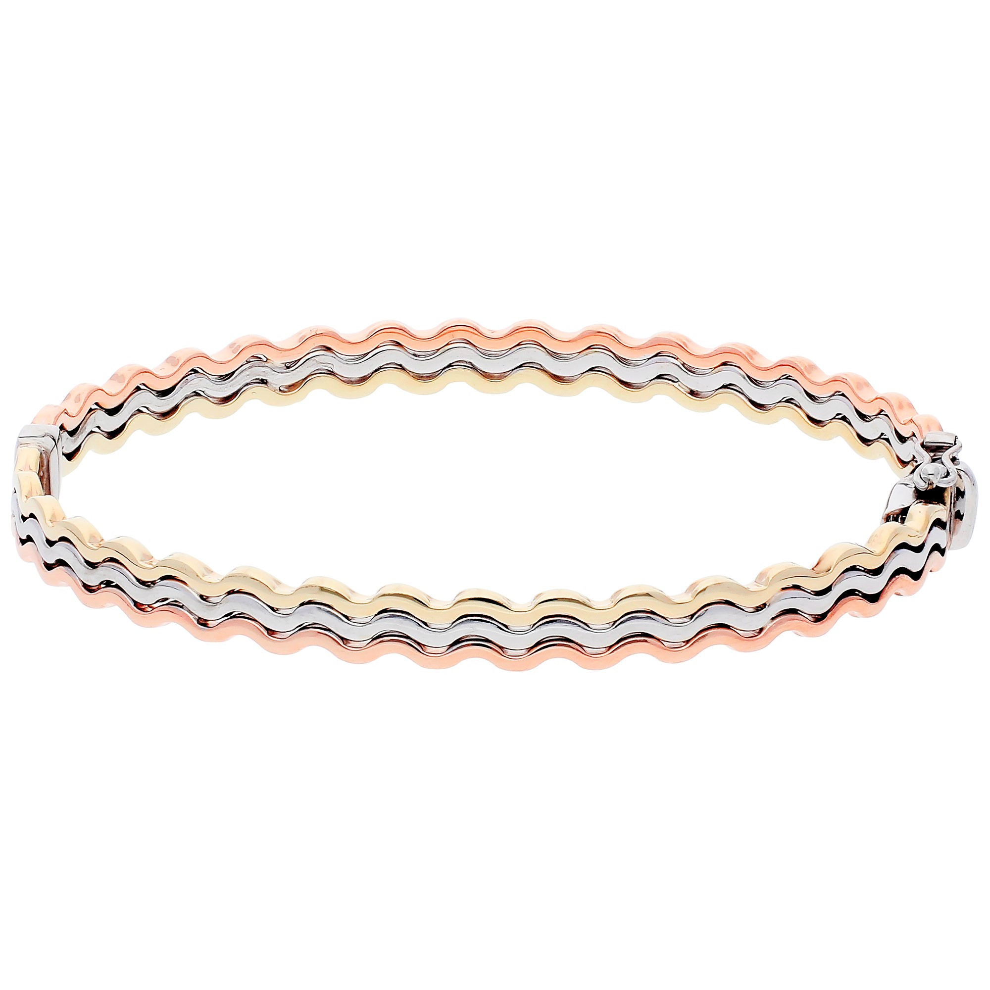 Elevate your accessory game with our luxurious 9ct Rose, White & Yellow Gold Bangle, designed to offer a chic and stylish statement. This elegant bangle combines three colours of gold in an eye catching wave design that captures the light and admires from every angle. The interplay of different gold tones provides a versatile look that complements any wardrobe, making it an ideal accessory for both day and evening wear. Crafted with precision and care, this hinged bangle is not only beautiful but also comfortable for daily wear. A wonderful gift for a special occasion, this three-tone gold bangle is an excellent choice for anyone looking to add a sophisticated and timeless piece to their jewellery collection.
