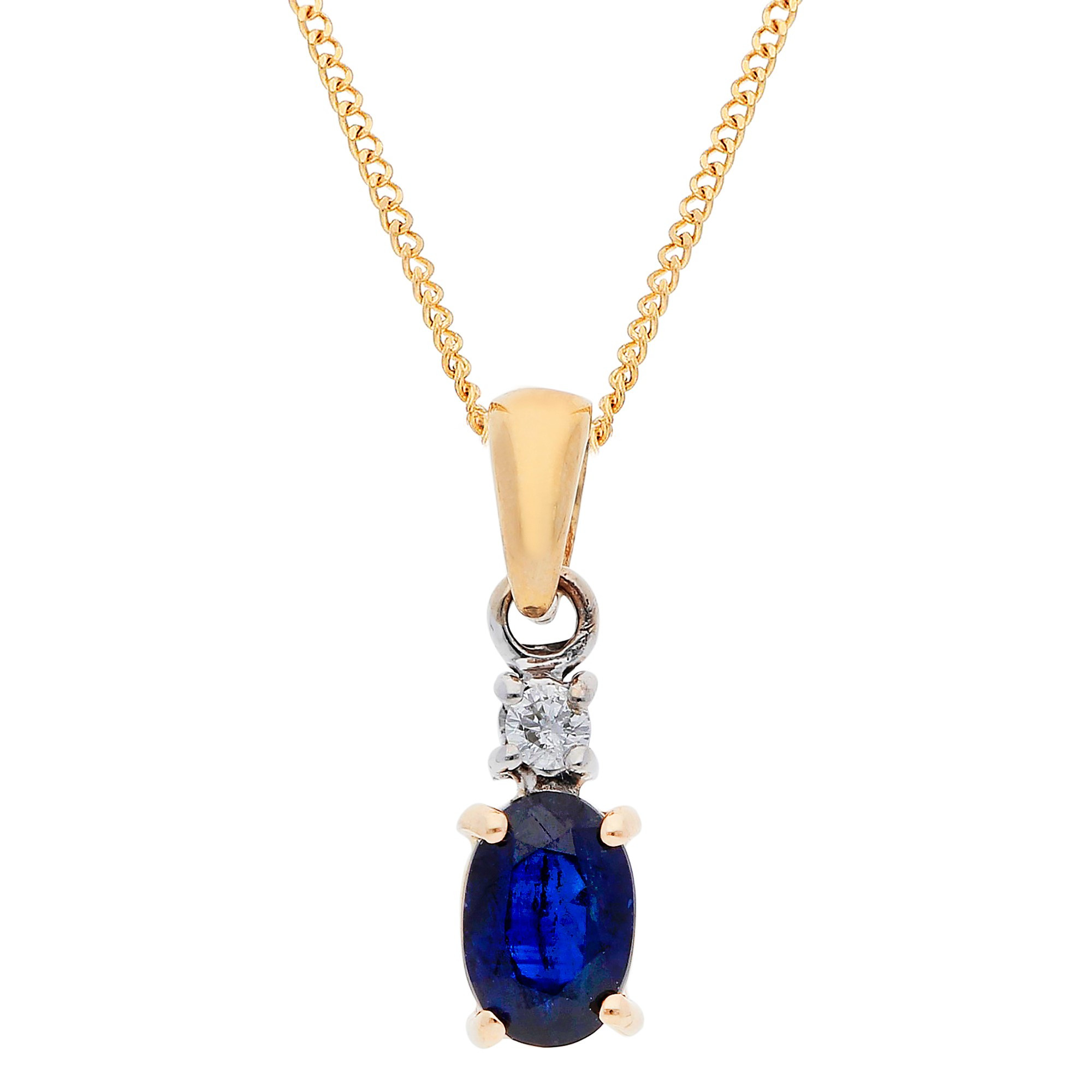 Embrace the beauty of fine jewellery with our 9ct Yellow Gold Diamond and Sapphire Pendant, a graceful addition to any collection. This piece features a captivating oval sapphire, claw set to highlight its vibrant blue depth, paired with a tiny diamond above in a white gold claw setting. The polished yellow gold bail complements the design, creating a stunning blend of rich colours and sparkle. Accompanied by a yellow gold chain with multiple length options on our website, this pendant offers a tailored fit for any style. Perfect for special occasions or as an everyday classic, this sapphire and diamond pendant is a timeless accessory that adds an air of sophistication to any outfit.