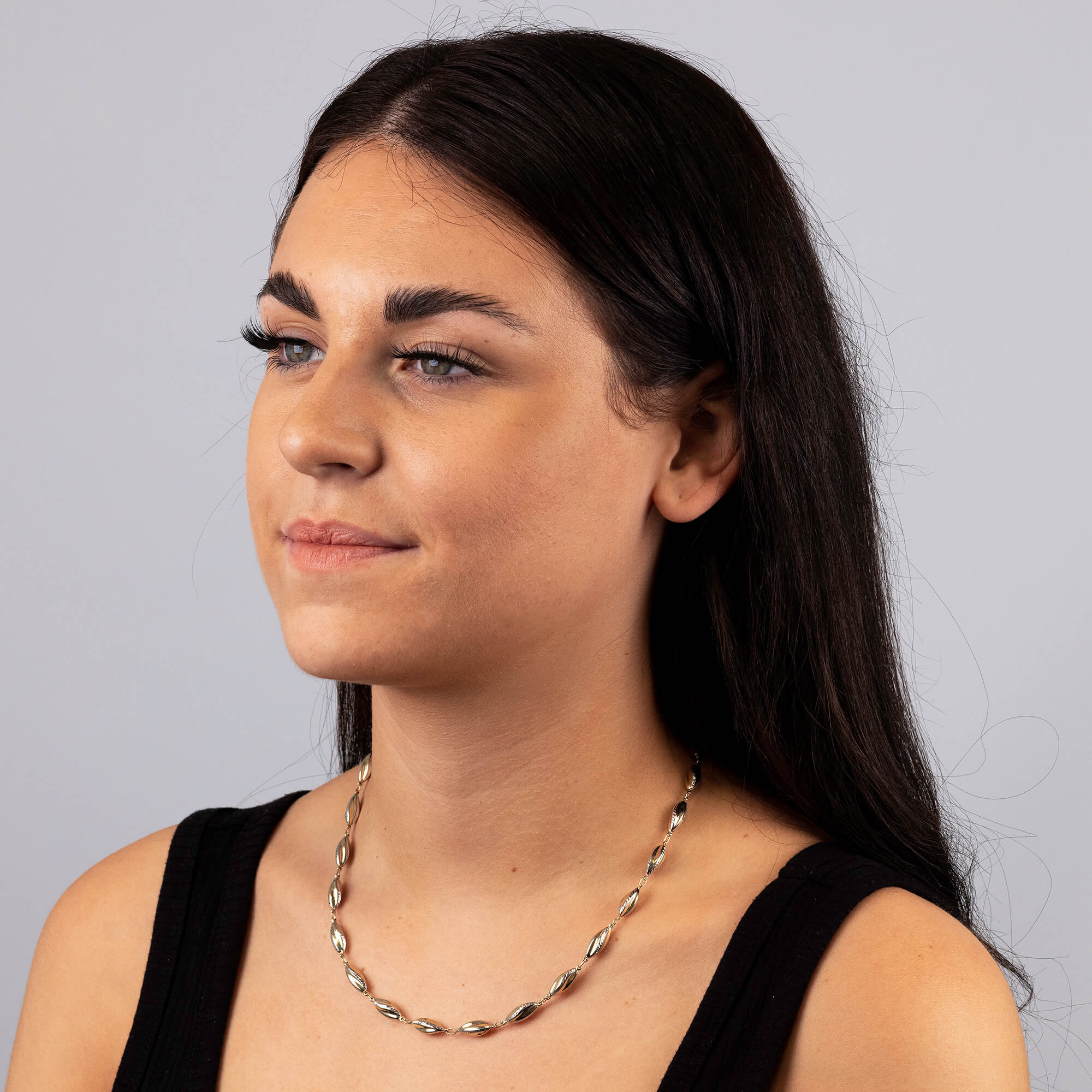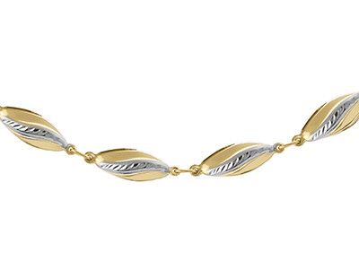 Introducing our beautifully crafted 9ct yellow gold necklace, designed to impress with its unique blend of elegance and contemporary style. The necklace features elongated bead links in luscious yellow gold, each adorned with intricate white gold detailing and a modern twist design. The meticulous attention to detail in this piece ensures that it catches the light and eyes from every angle. Comfortable and secure around your neck, this necklace is perfect for daily wear or special occasions, complementing any ensemble with its subtle yet stunning appearance. It's an exceptional choice for those who appreciate jewellery that combines traditional charm with modern aesthetics.