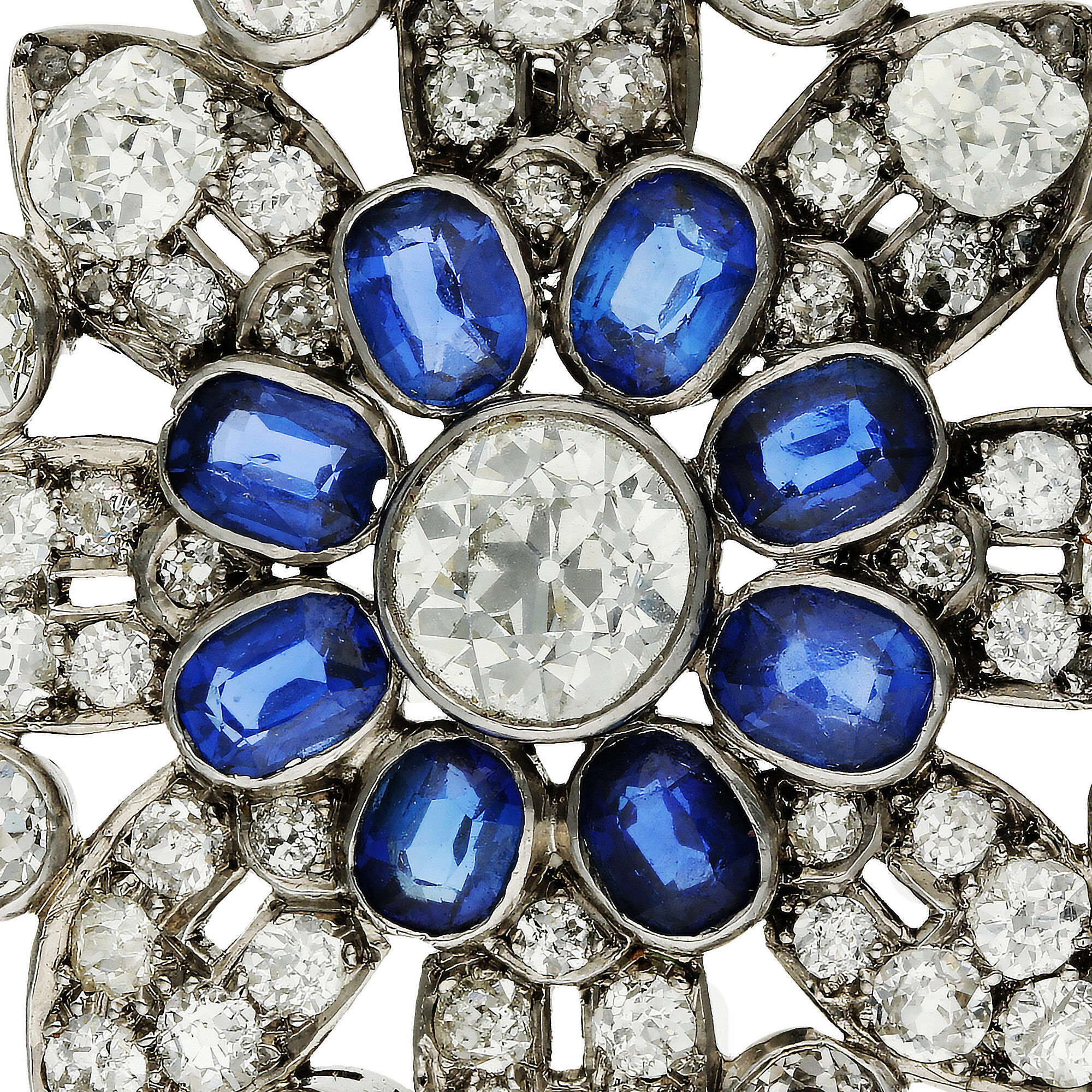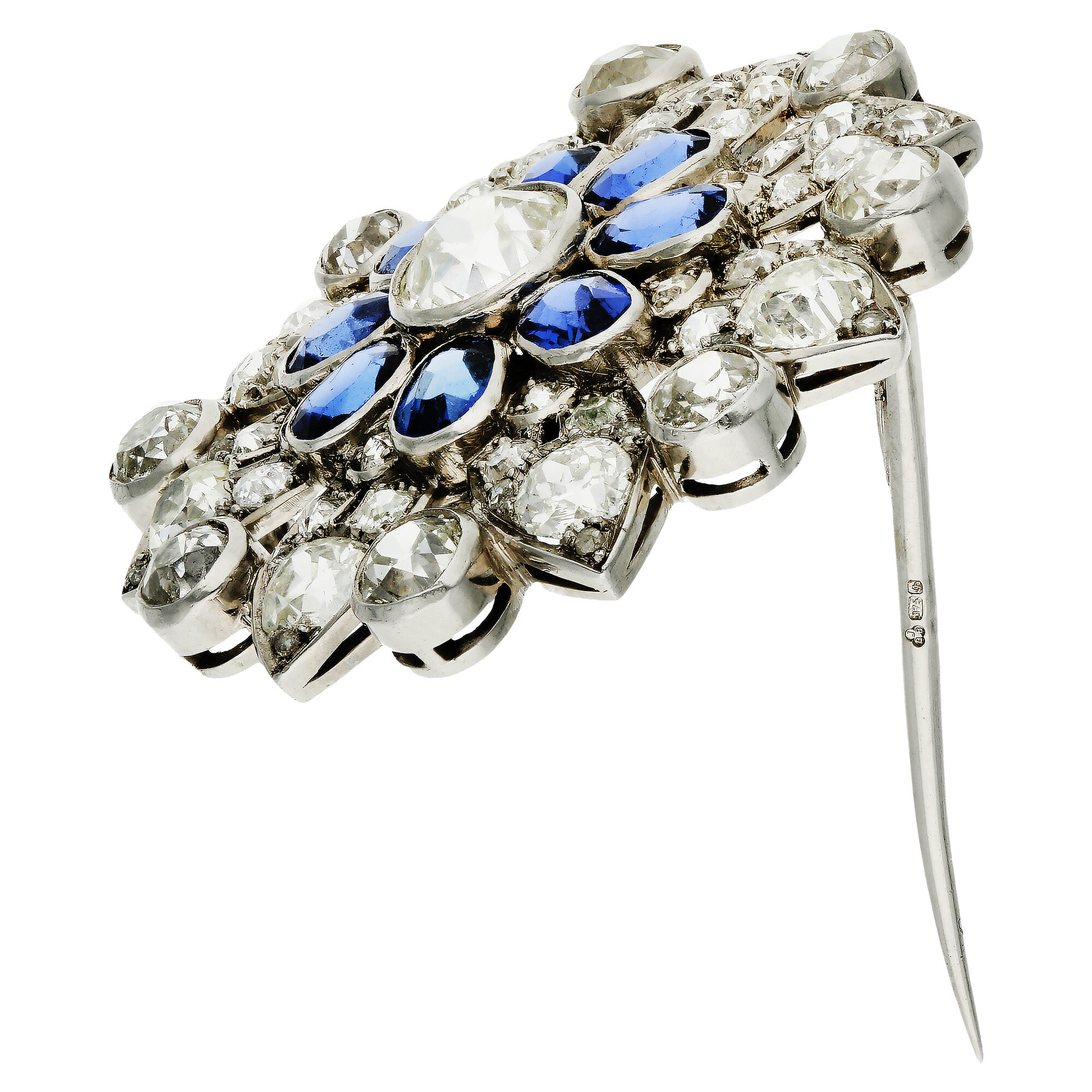 Elevate your accessory collection with this stunning Sapphire and Diamond Flower Brooch, a masterpiece of fine jewellery design. Featuring a central old circular cut diamond surrounded by vibrant oval sapphires and an outer layer of graduated circular cut diamonds, this vintage brooch sparkles with unmatched elegance. Crafted with a platinum body and 18ct white gold settings, it is secured with a 9ct white gold pin and fittings, combining strength with beauty. This luxurious brooch is a versatile piece that can adorn any outfit, making it an ideal choice for those seeking to make a sophisticated and timeless statement.
