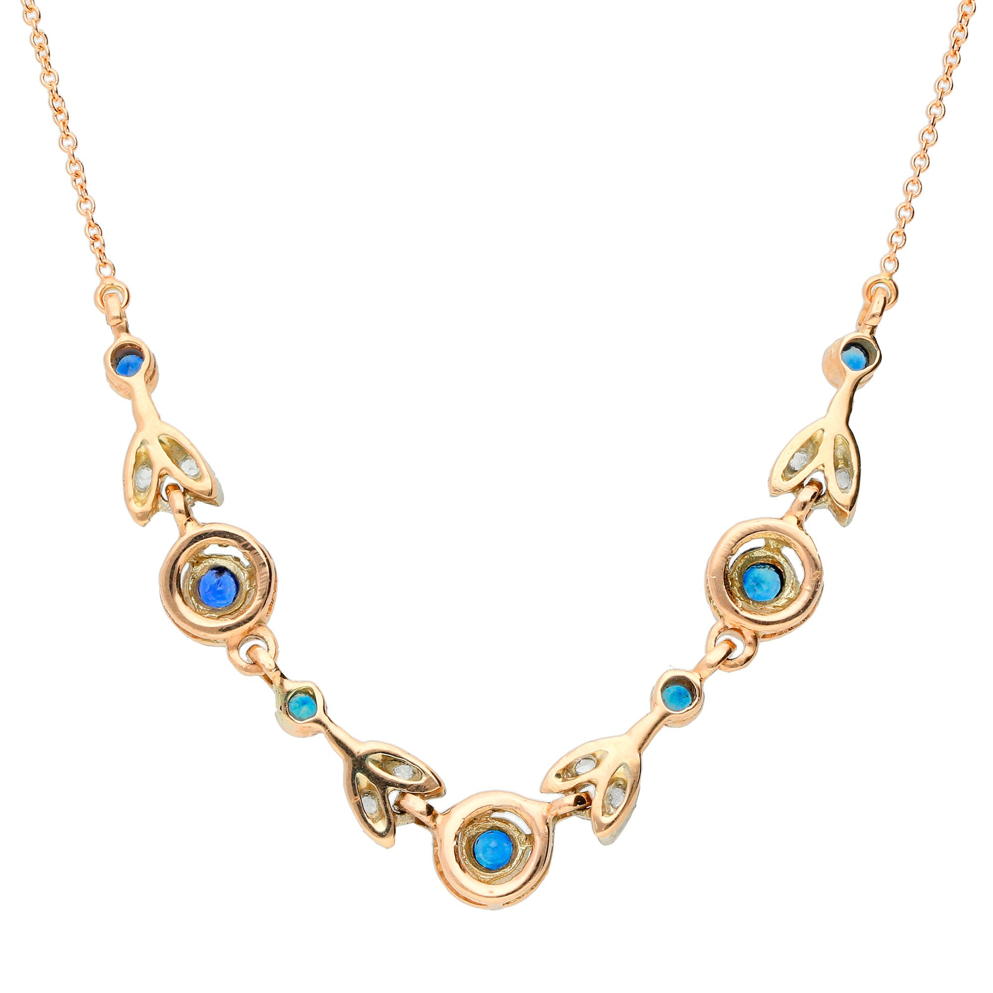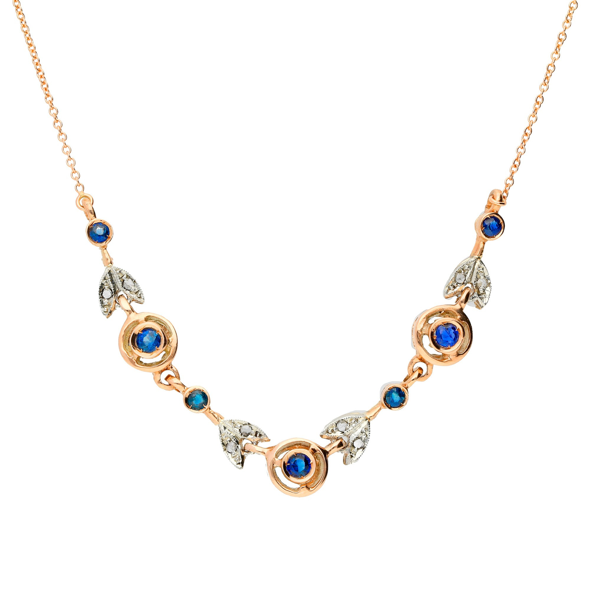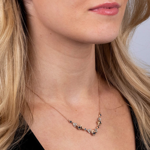 Discover the timeless allure of Italian craftsmanship with our 9ct Rose Gold Sapphire & Diamond Necklace, handcrafted by skilled goldsmiths in Naples, Italy. This elegant necklace features a series of 0.75ct round sapphires, each held in warm rose gold settings to beautifully enhance their vibrant blue hues. Intertwined with the sapphires, silver leaves are delicately set with tiny rose-cut diamonds, adding an enchanting sparkle and refined detail. The contrasting elements of rose gold and silver, combined with the intricate design, make this necklace a truly distinctive piece. Perfect for those who appreciate fine Italian artistry, this necklace is an ideal choice for adding elegance to any outfit, whether casual or formal. A beautiful gift or a unique addition to your jewellery collection, this sapphire and diamond necklace embodies classic charm and exceptional craftsmanship that will be cherished for years to come.