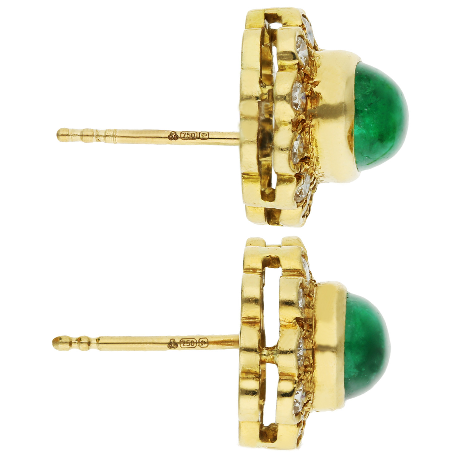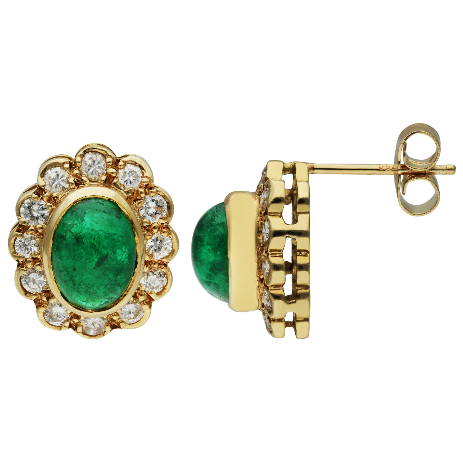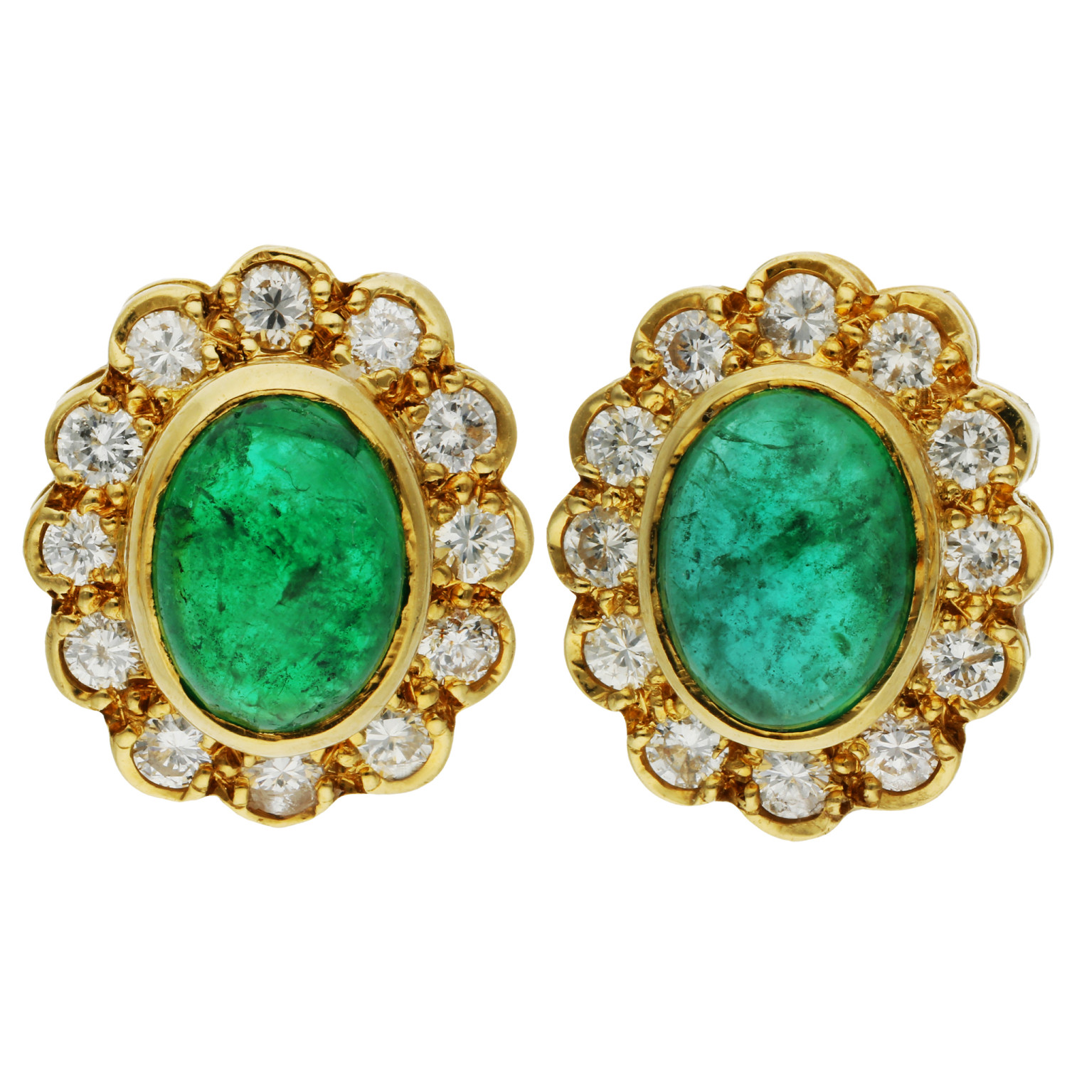 Each earring features a captivating oval emerald cabochon at its centre, radiating a rich green hue that epitomizes opulence and refinement. These enchanting emeralds are elegantly surrounded by a halo of round brilliant-cut diamonds, creating a striking contrast that highlights the gemstones' natural beauty.