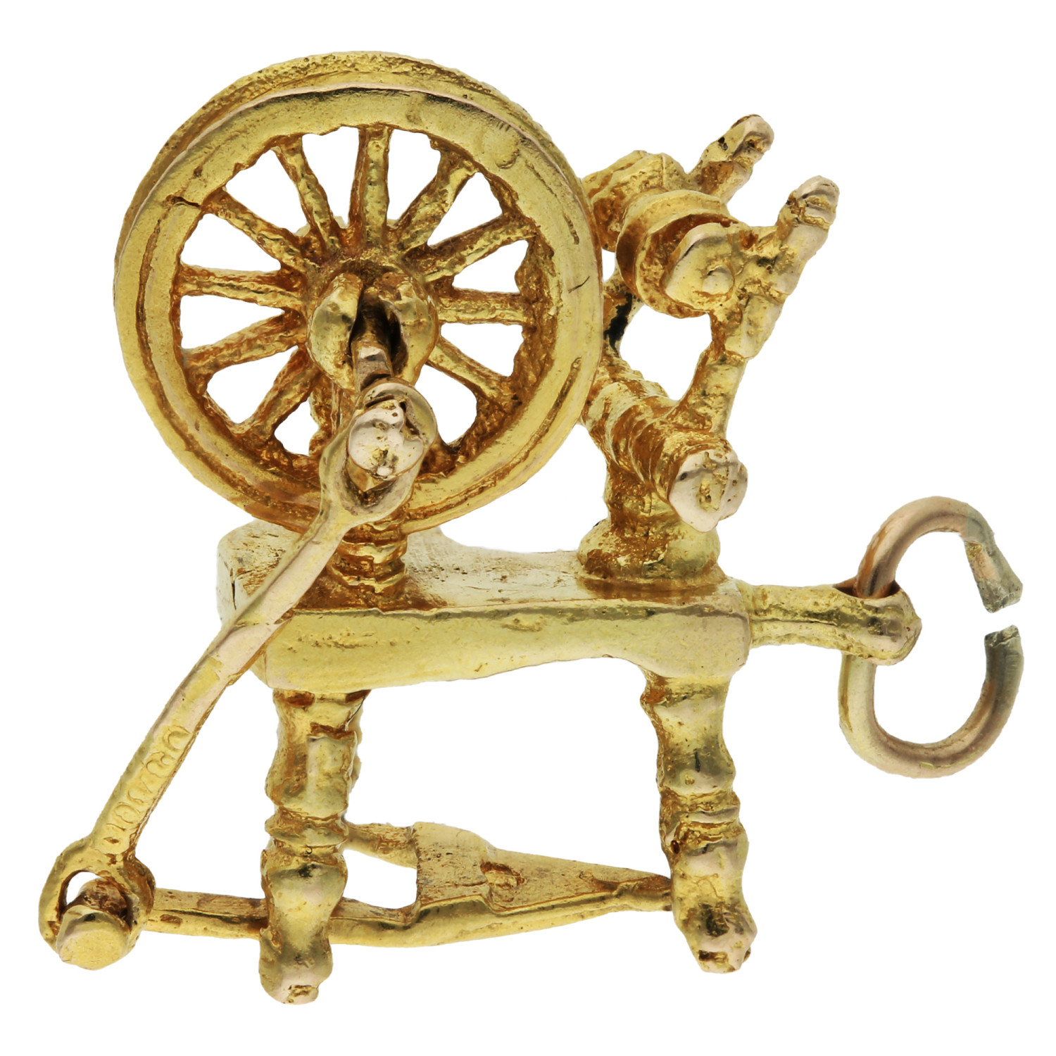The charm features a miniature spinning wheel, ingeniously designed with a wheel that actually turns, adding a dynamic and whimsical touch to its design. The precise detailing in the wheel's structure and the delicate golden spokes demonstrate a high level of artistry. Enhanced by the rich golden hues and a polished finish, this charm exudes a vintage elegance, making it a captivating addition to any jewellery collection.