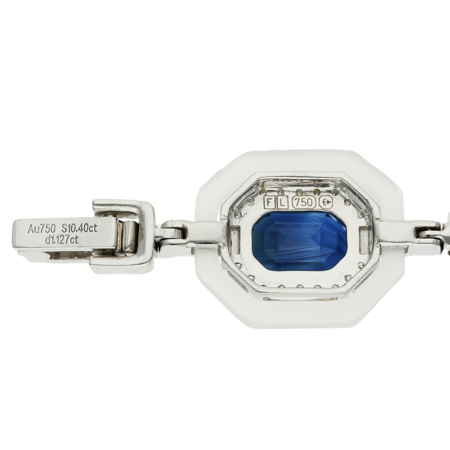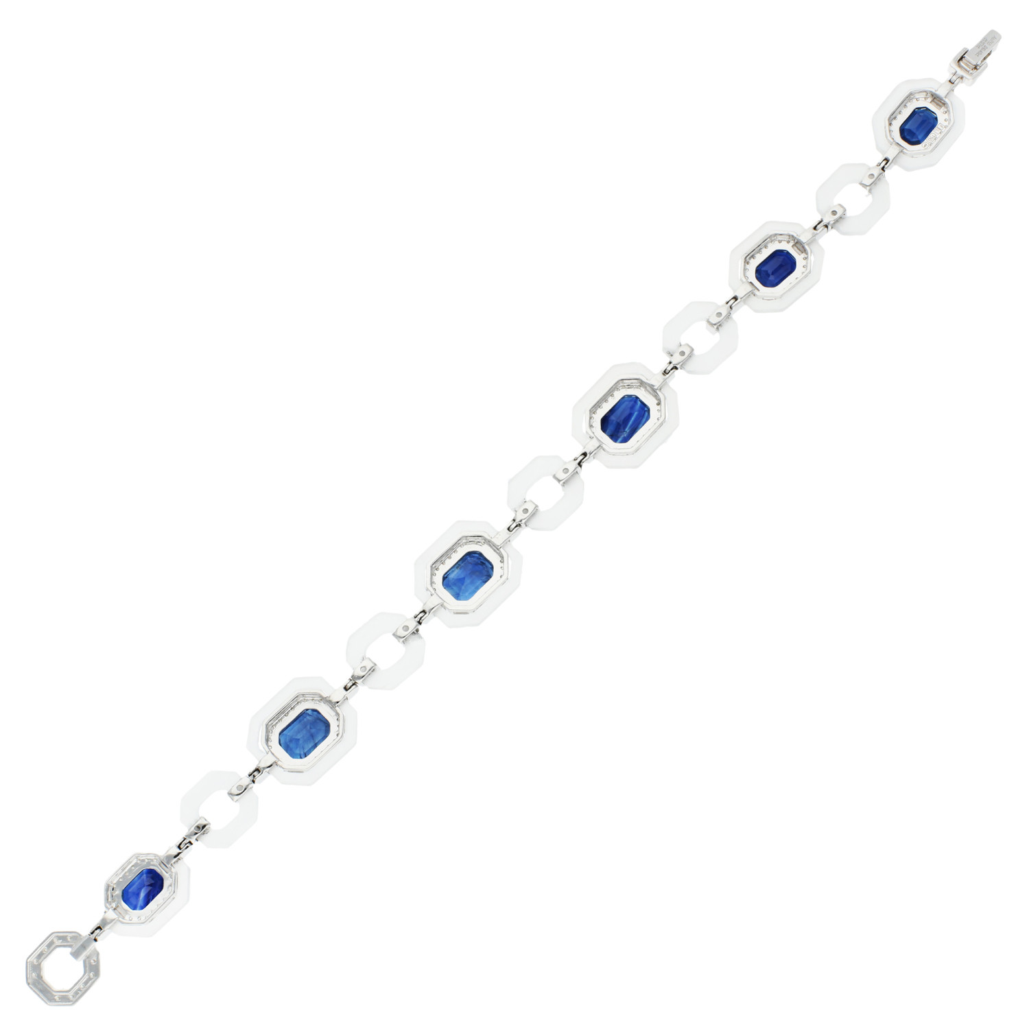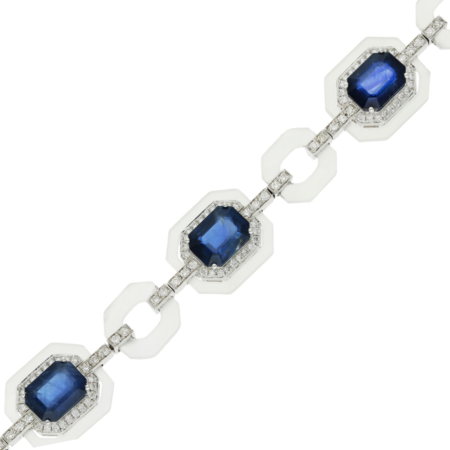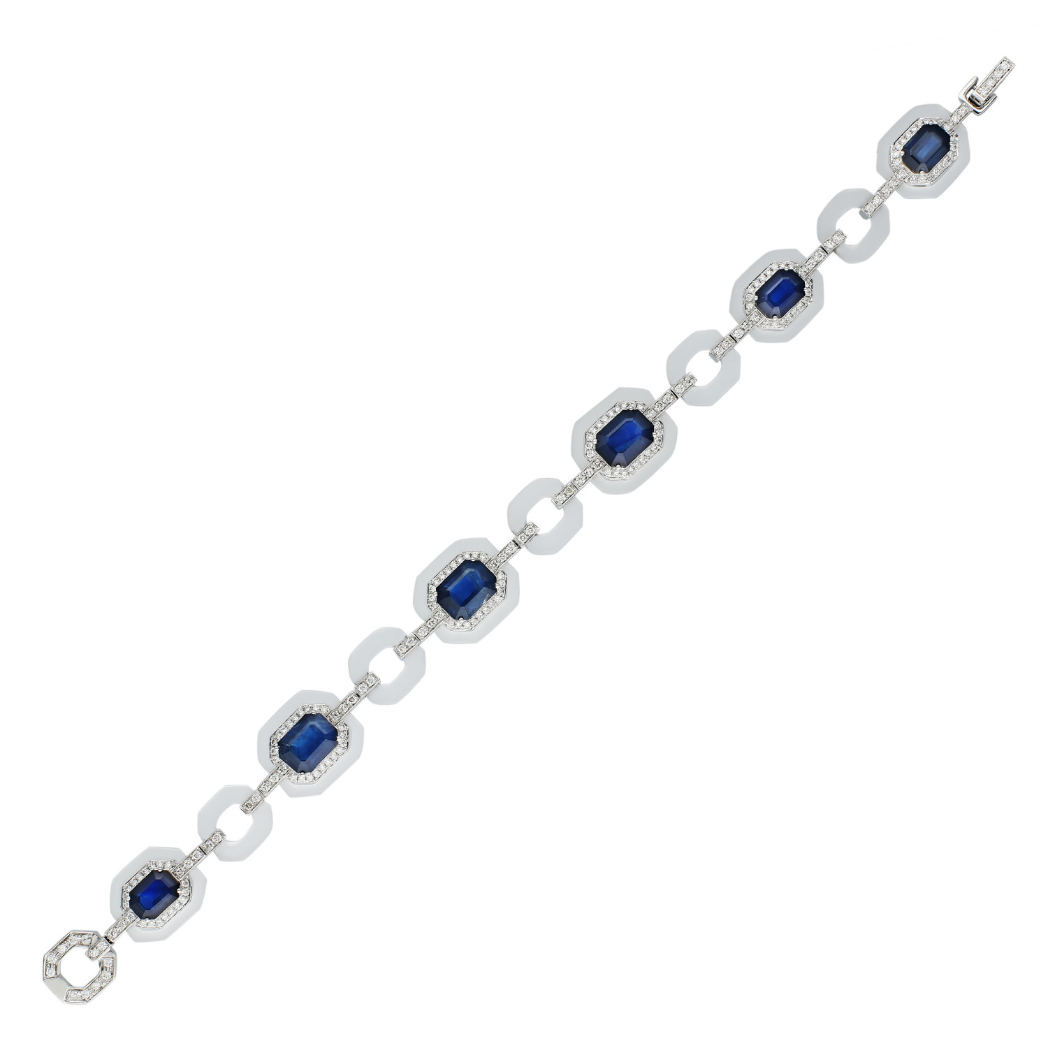 The rich, mesmerizing blue of the sapphires stands out, surrounded by the dazzling light of diamonds, creating a stunning visual contrast. The addition of rectangular cut frosted rock crystal interspersed between the sapphires and diamonds introduces a unique, modern twist, enhancing the bracelet's captivating appeal.