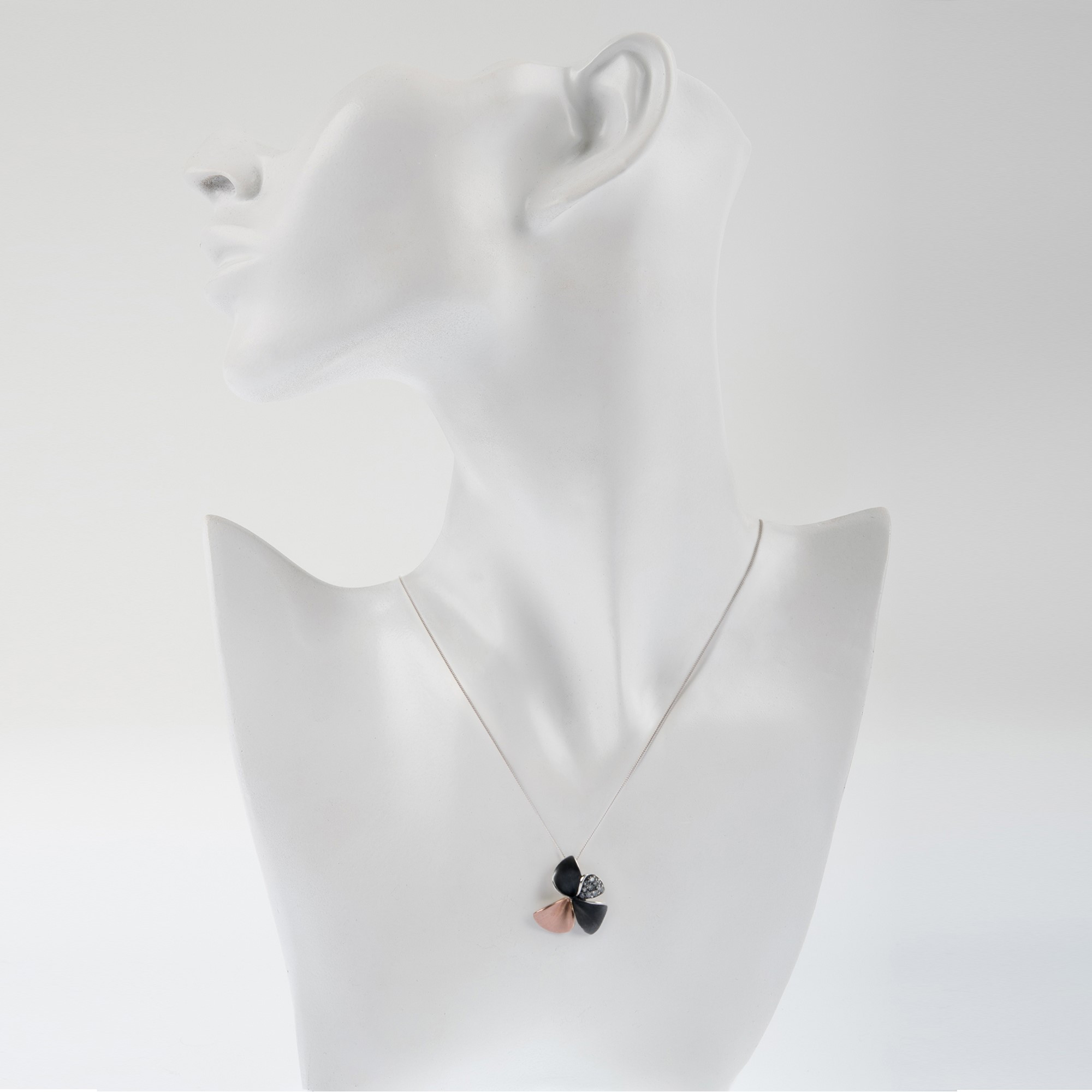 Discover the elegance of floral-inspired design with this enchanting Cubic Zirconia and Sterling Silver Sweet Pea Pendant. The pendant showcases a stylized sweet pea bloom, featuring two black oxidised petals and one rose gold vermeil-accented petal for a distinctive, eye-catching look. Each petal is crafted from sterling silver and enhanced by shimmering cubic zirconia, adding a touch of sparkle to this charismatic piece.