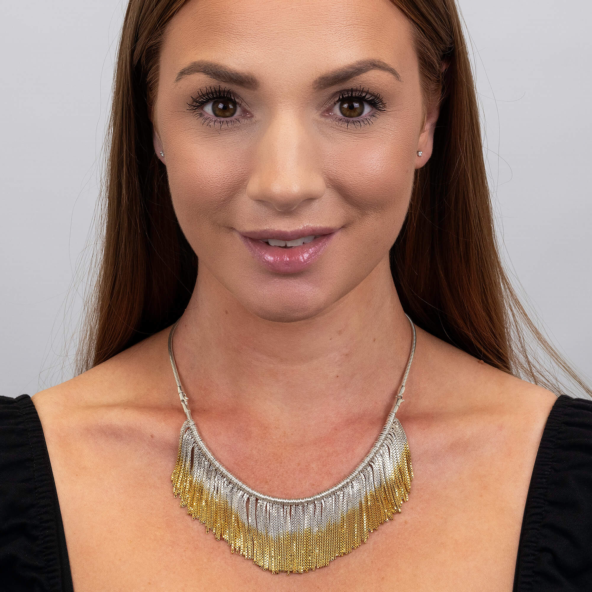 Discover the chic, versatile style of this Sterling Silver Necklace from Cara Tonkin’s Vesper range. Crafted with a fringe of polished silver snake chains and finished with gold plated tips, this necklace creates a striking mixed-metal look that catches the light beautifully. Designed to be worn either as a draping necklace or a layered bracelet, it brings adaptability to your jewellery collection. Each element is polished to perfection, with partial gold plating adding a touch of warmth and elegance. British designer Cara Tonkin has crafted this piece to be effortlessly stylish, embodying the elegance of modern design with practical wearability. An ideal choice for those who love flexible, fashion-forward pieces that make a statement.