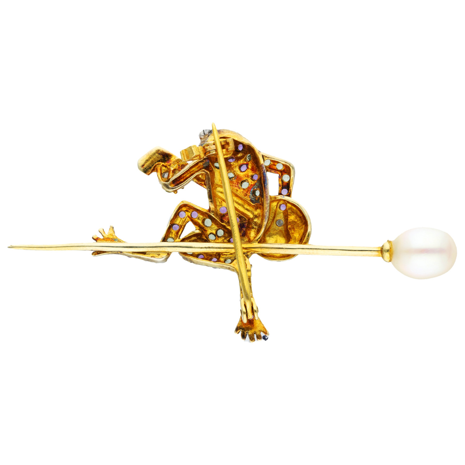 Discover the whimsical charm of our Silver Peridot, Amethyst, & Pearl Frog Brooch, a unique piece that blends playful design with luxurious gemstones. This exquisite brooch, crafted from silver and gold-plated silver, features a delightfully detailed frog serenading on a banjo, adorned with sparkling diamond, vibrant green peridot, and rich purple amethyst accents. The scene is elegantly mounted on a pin, culminating in a sophisticated cultured pearl at its end, adding a touch of elegance.