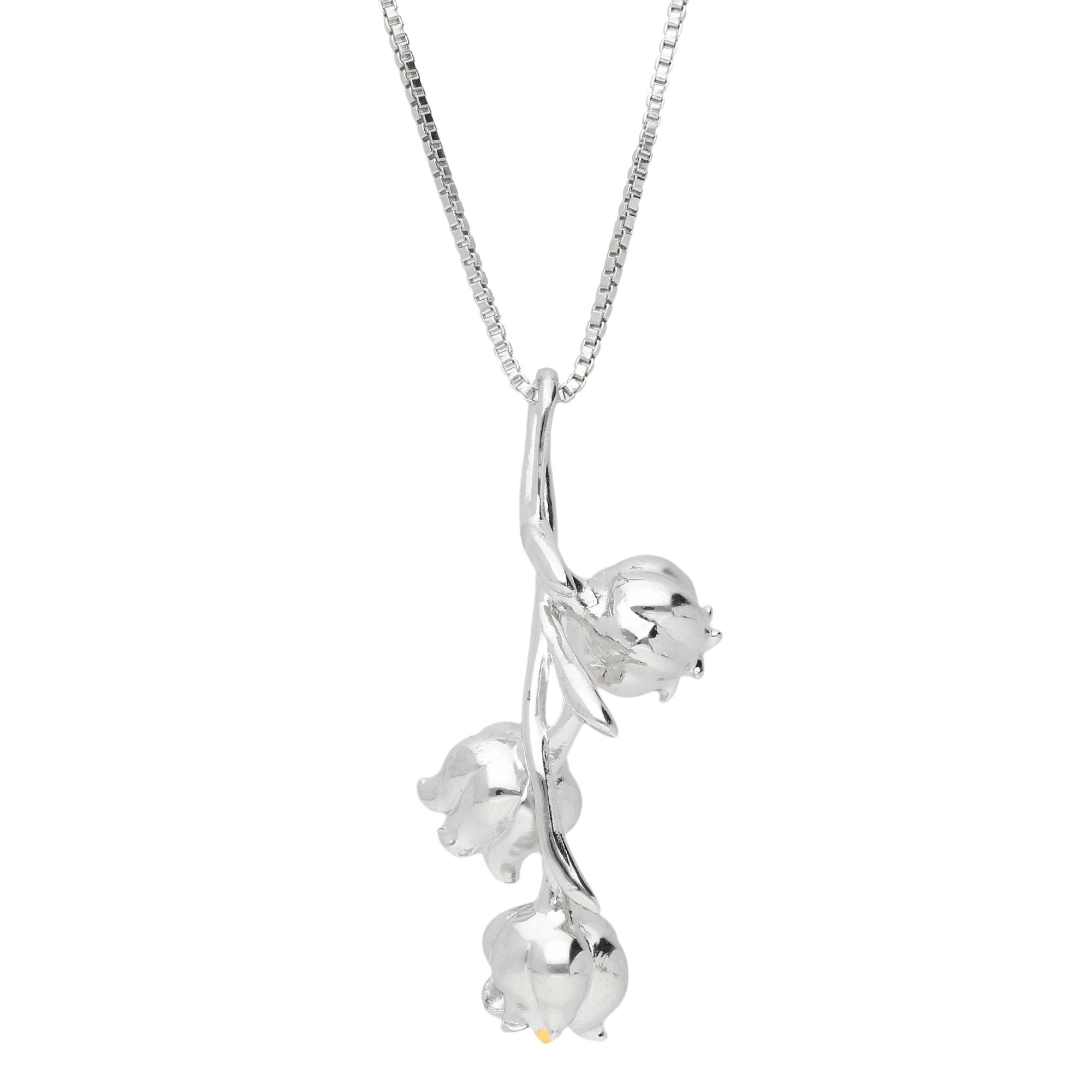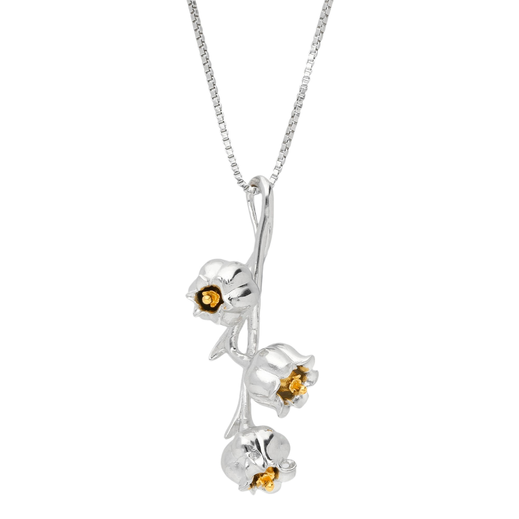 Expertly crafted in sterling silver, the pendant showcases intricate detailing with eye-catching yellow gold plated centres that enhance the delicate design of the lily of the valley. Suspended from an adjustable 16 to 18-inch box link chain, this necklace offers both beauty and versatility for any occasion.