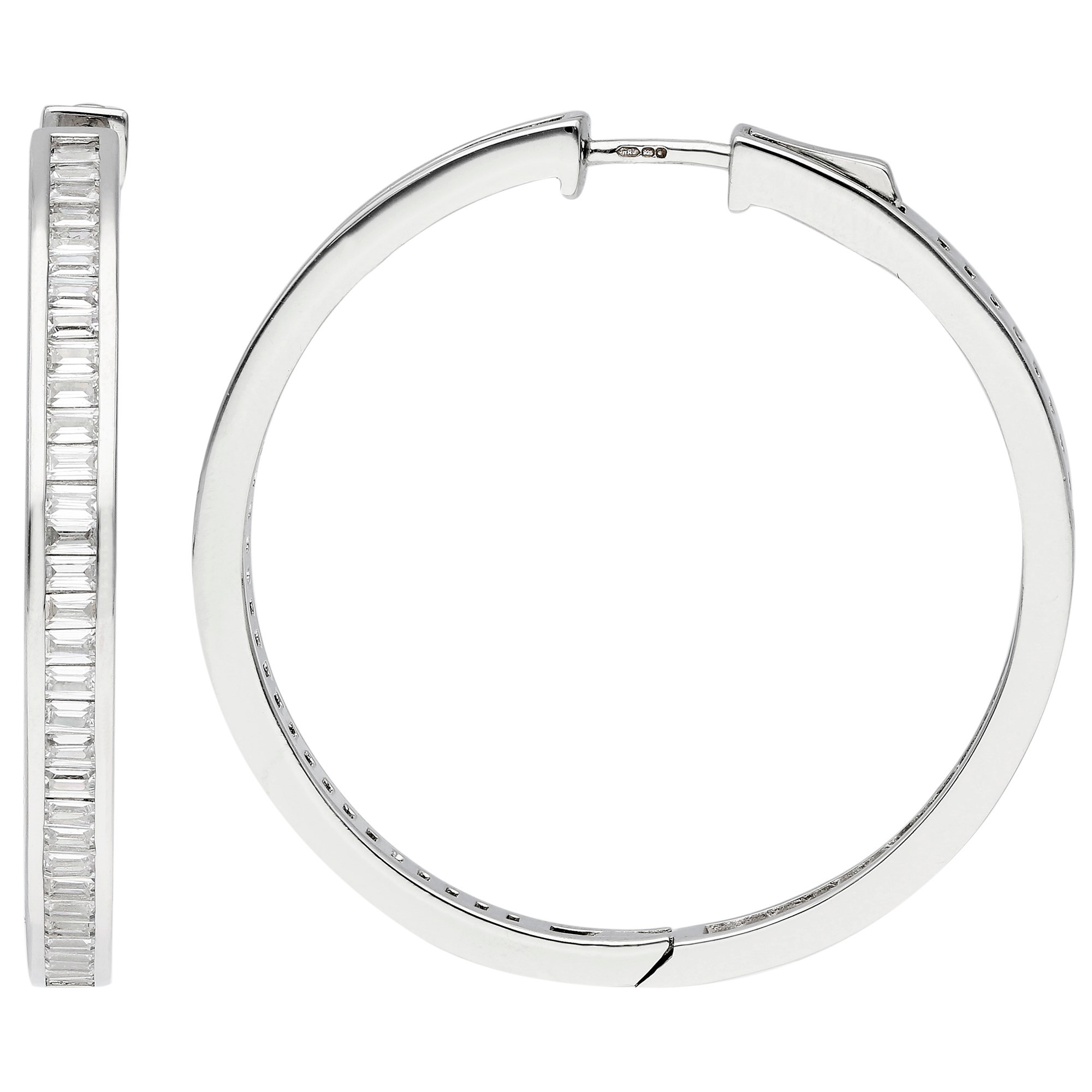 Step out in style with our stunning 40mm hoop earrings, crafted from premium sterling silver and adorned with chic baguette cut cubic zirconia. These women's earrings feature a sleek hinged design and a secure press button post lock fastening, combining effortless elegance with practicality. The sparkling cubic zirconia are expertly channel set, enhancing the overall shine and appeal of the earrings. Whether you're attending a glamorous event or looking to elevate your everyday ensemble, these sterling silver hoops offer versatility and sophistication. Their generous size and dazzling embellishments make them a standout addition to any outfit, ensuring you capture attention wherever you go.