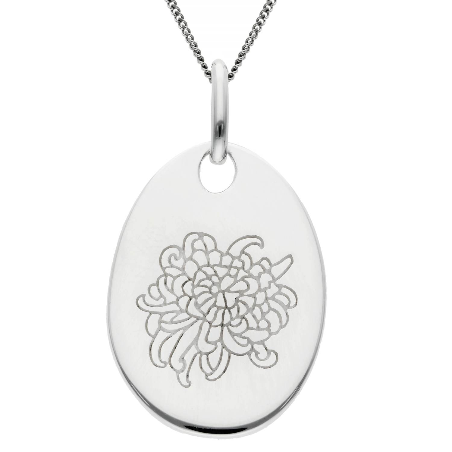 Mark a meaningful moment with the Sterling Silver Chrysanthemum Birth Bloom Pendant, celebrating November’s birth flower. Meticulously crafted from recycled sterling silver, this exquisite tag pendant showcases a detailed chrysanthemum engraving, a symbol of cheer and vitality.