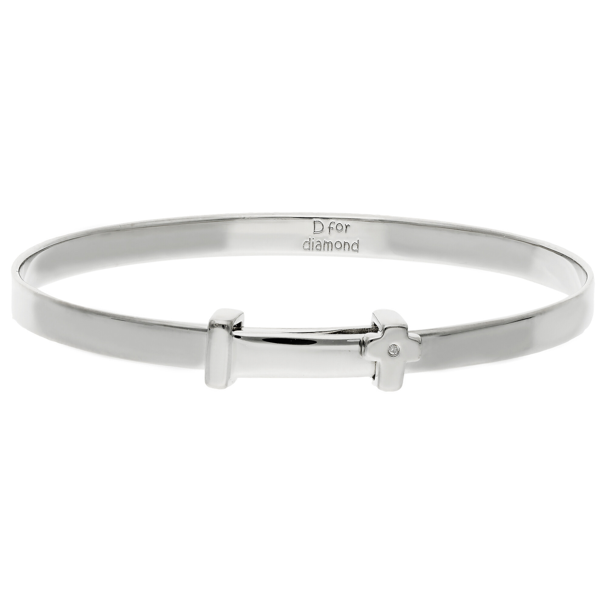 Discover the perfect accessory for your child with this charming D for Diamond Sterling Silver Bangle. This delightful bangle is designed to be both stylish and durable, crafted from recycled sterling silver with a sleek platinum plating. It features a beautifully integrated cross motif, highlighted by a tiny, glistening diamond (0.003ct) at its heart. This piece makes an ideal gift for any occasion, offering a touch of elegance that will grow with them through the years. A thoughtful and elegant choice, this bangle will become a treasured part of your little one’s jewellery collection.