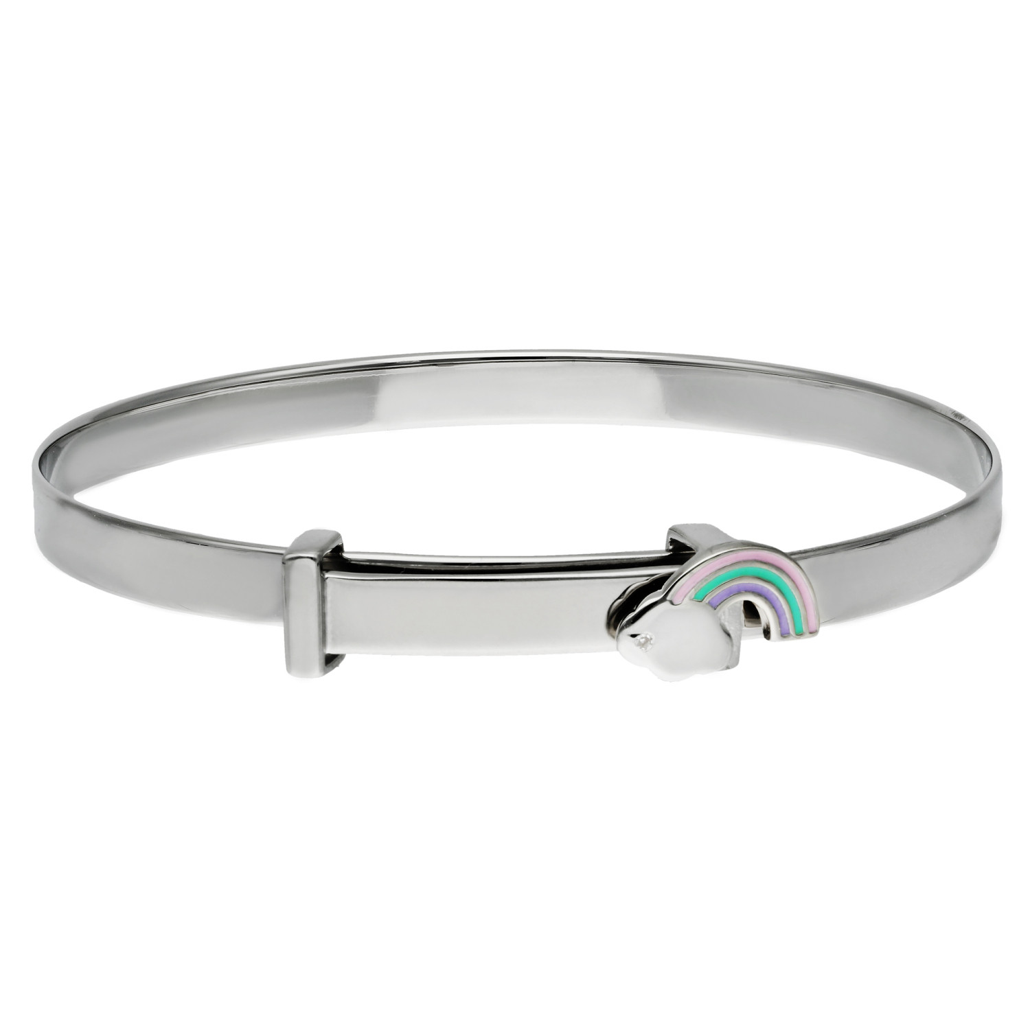 Celebrate colour and creativity with our delightful Rainbow Expandable Bangle. Crafted from eco-friendly recycled sterling silver, this bangle dazzles with its bright enamel hues forming a cheerful rainbow design. At the heart of this playful piece is a small but striking diamond (0.003ct) set within the cloud motif, providing a subtle yet luxurious sparkle. The bangle's expandable feature allows for a custom fit, making it a versatile addition to any jewellery lover’s collection. Perfect for gifting, this bangle comes with a free engraving service, allowing you to personalise it with a meaningful inscription inside and out. It's an ideal choice for adding a pop of colour and personal touch to your daily wear.